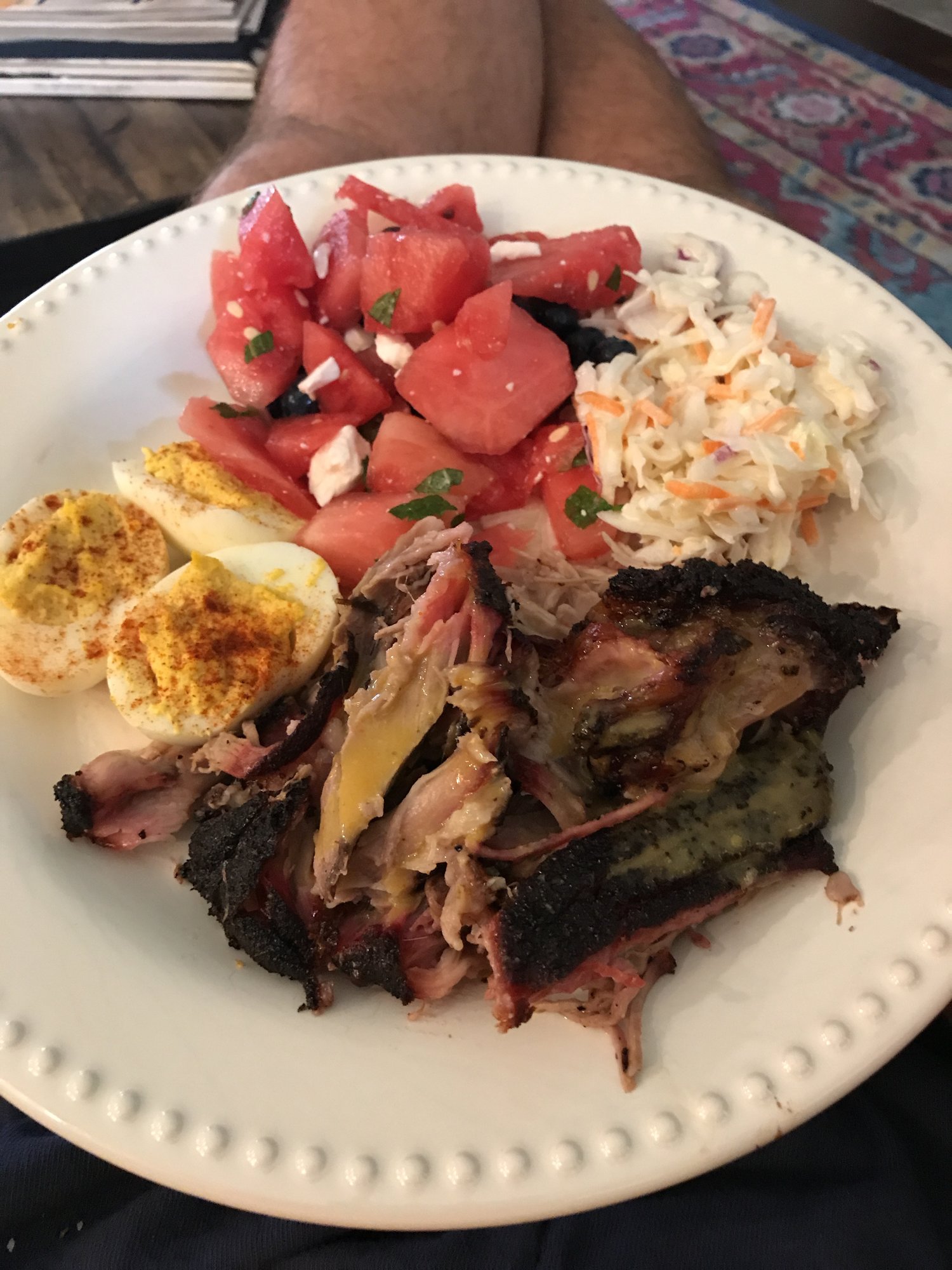 Nothing really special just a good summer meal. Cooked a little warmer than normal to speed up at 250-275 grid temp and pulled at 205 dry rubbed with dizzy dust and Game On!. 5.6 LB butt so fairly small.