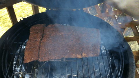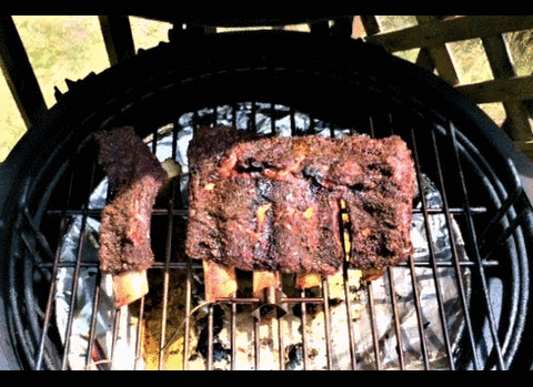 Sunday morning, finally got those Beef Ribs over some Chunks o' Hickory . . .