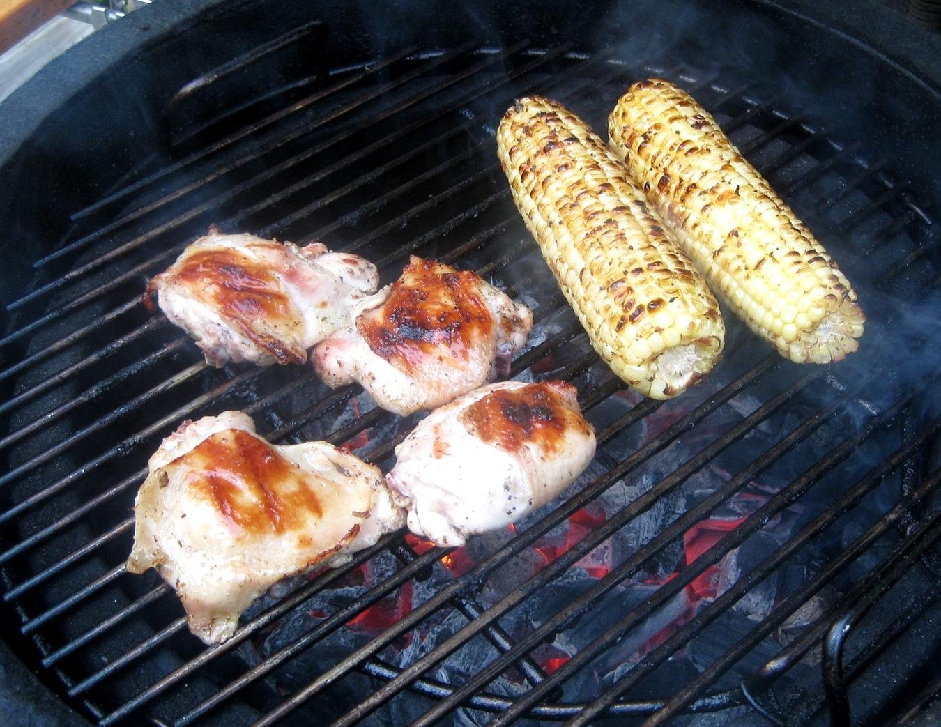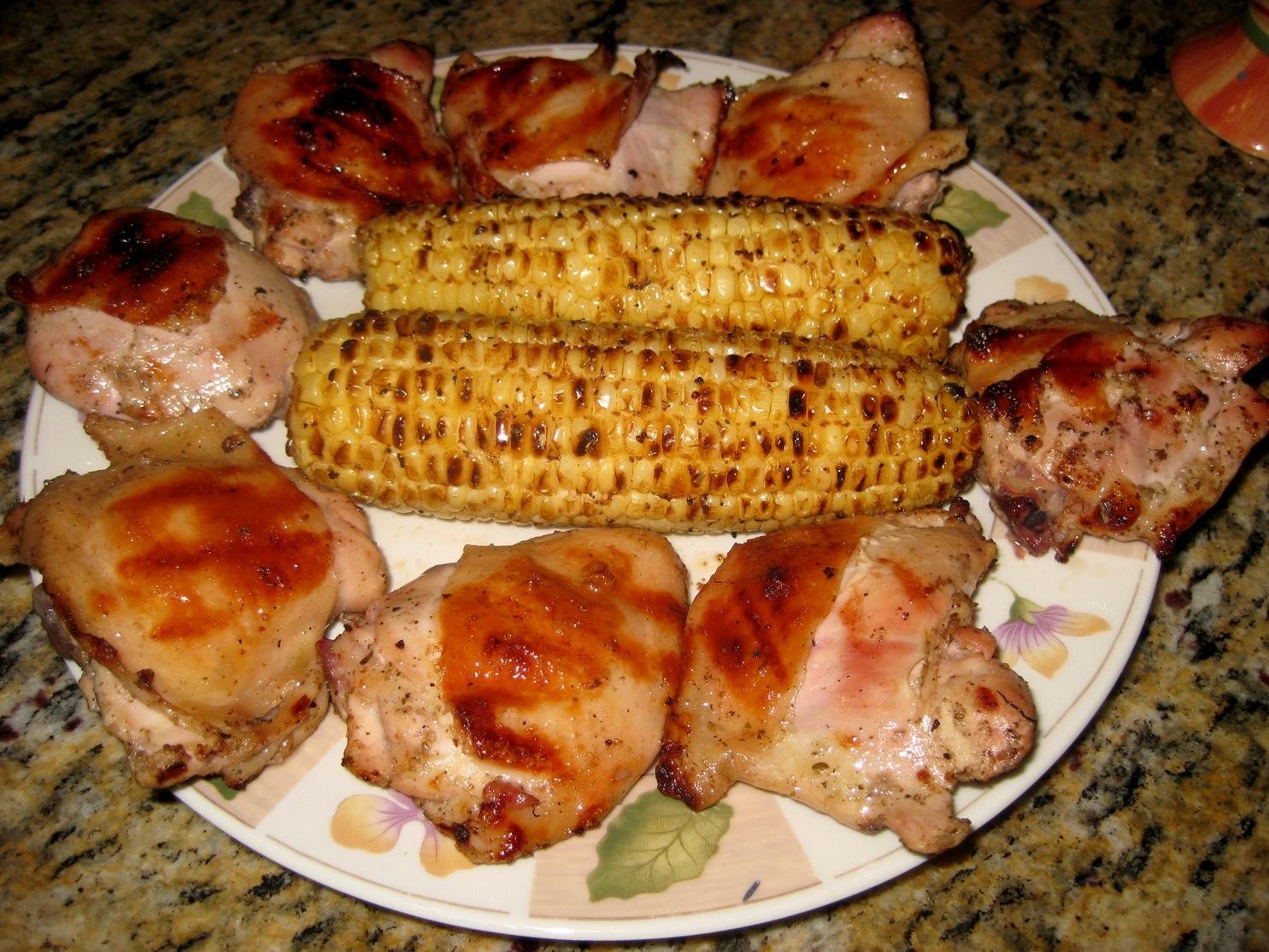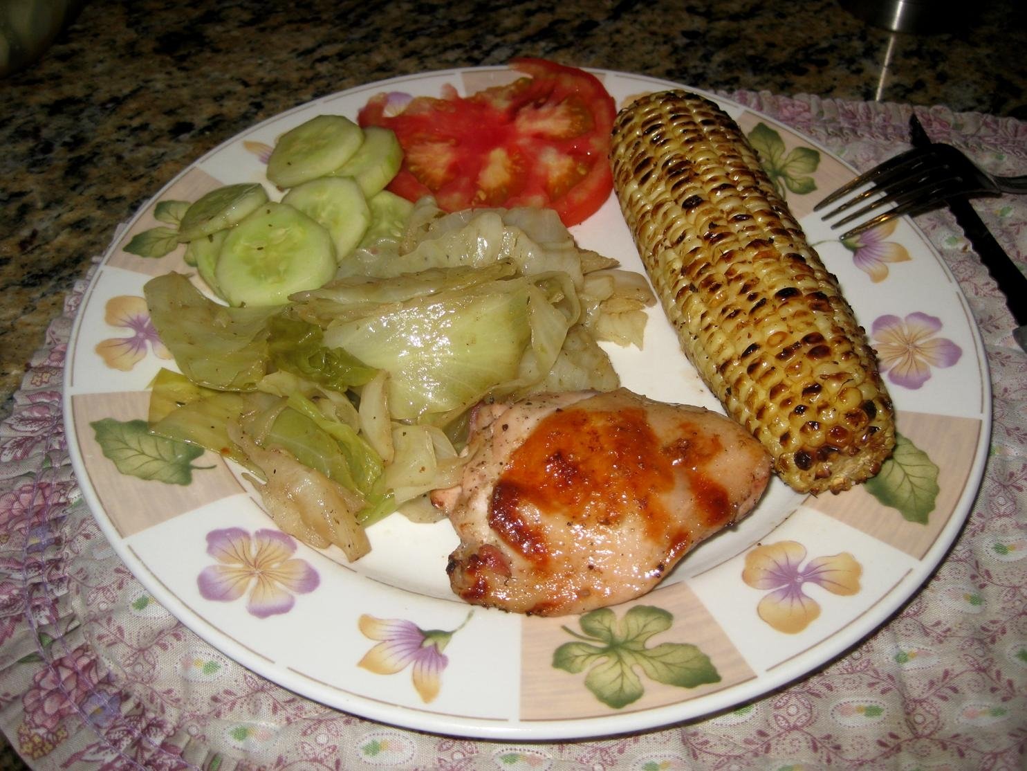 Tonight I made some grilled thighs served with grilled corn, fried cabbage, marinated cucumbers and freshly sliced tomatoes. The squash and green beans I bought will be for tomorrow.