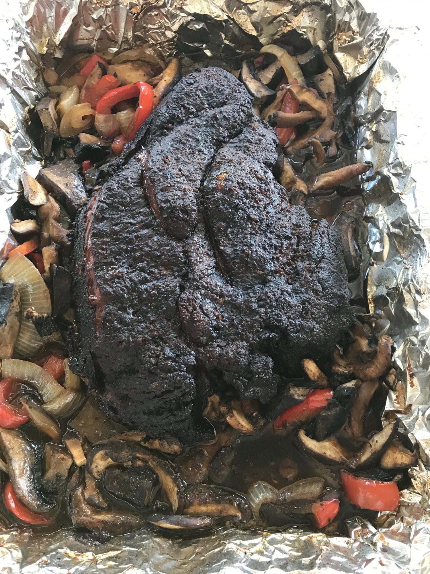 Placed it in a pan filled half full with cut up onions, red peppers, mushrooms and well lubricated with Guinness stout and Worcestershire. Covered tightly with HDAF. Back in the Egg at 350°F until it was 210°F. Shredded the beef and it just didn't seem right.