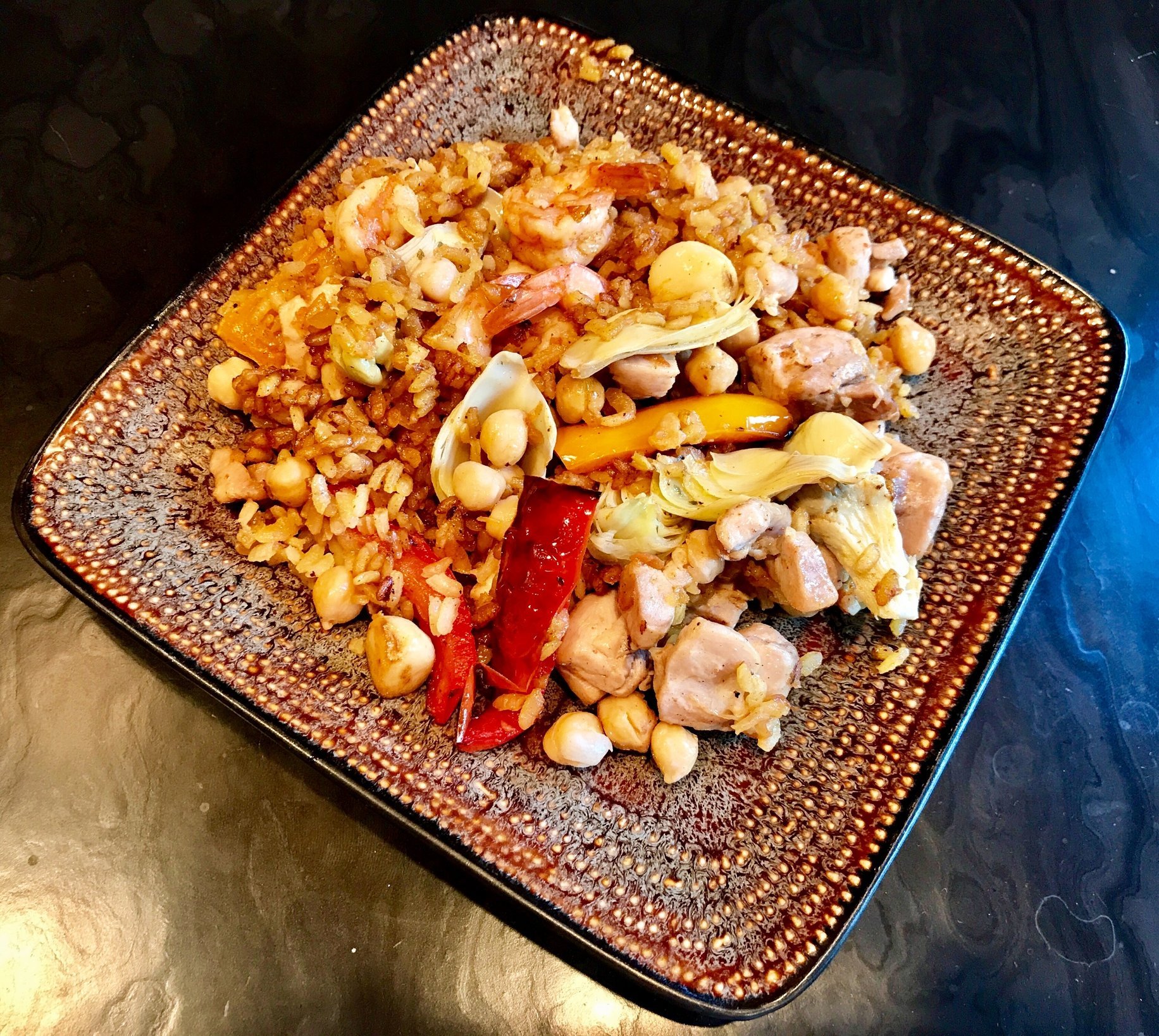 No Egg pics but damn it was good.   Chicken,shrimp, red n yellow peppers, garlic, artichokes and the natural paella ingredients