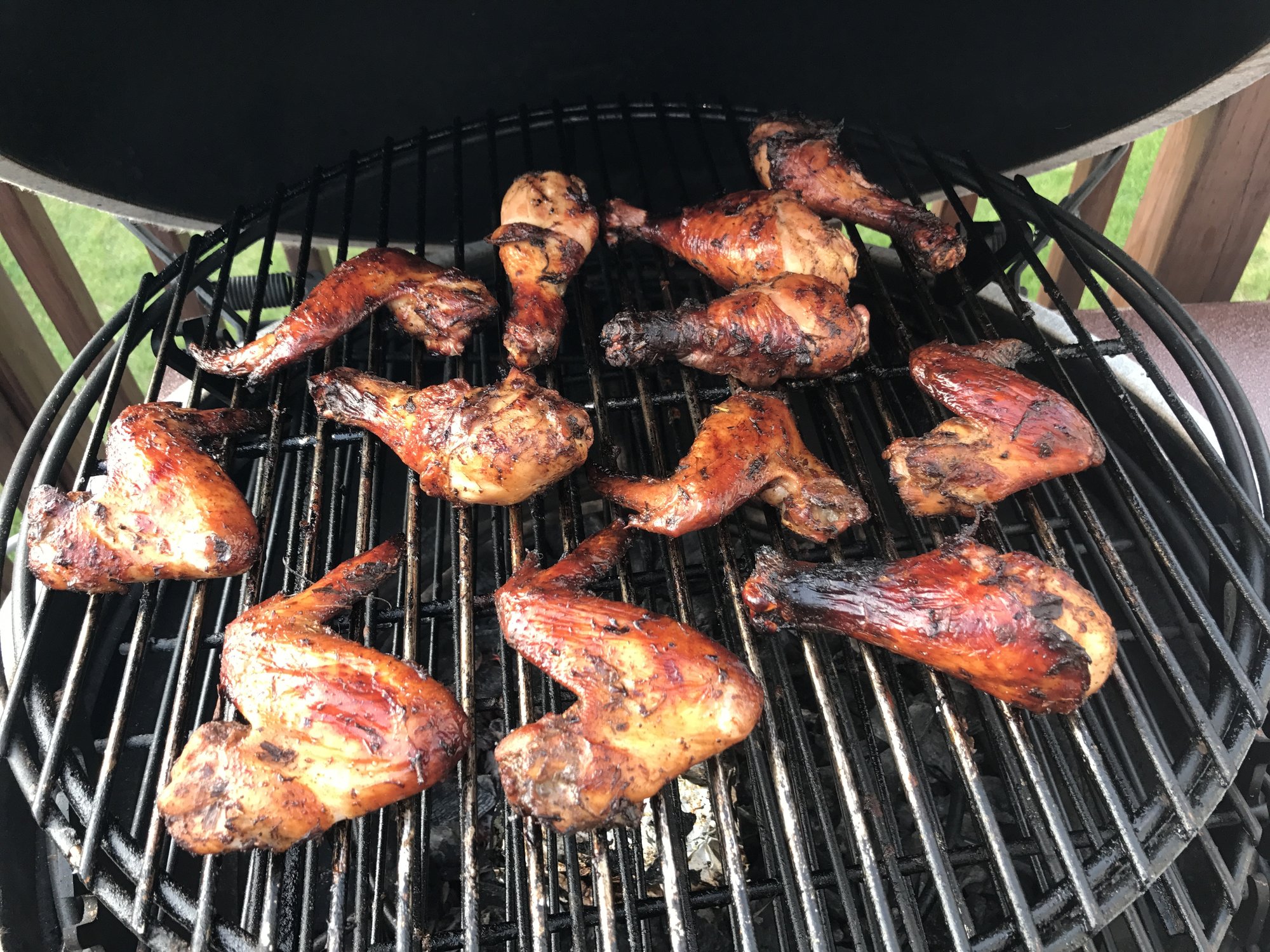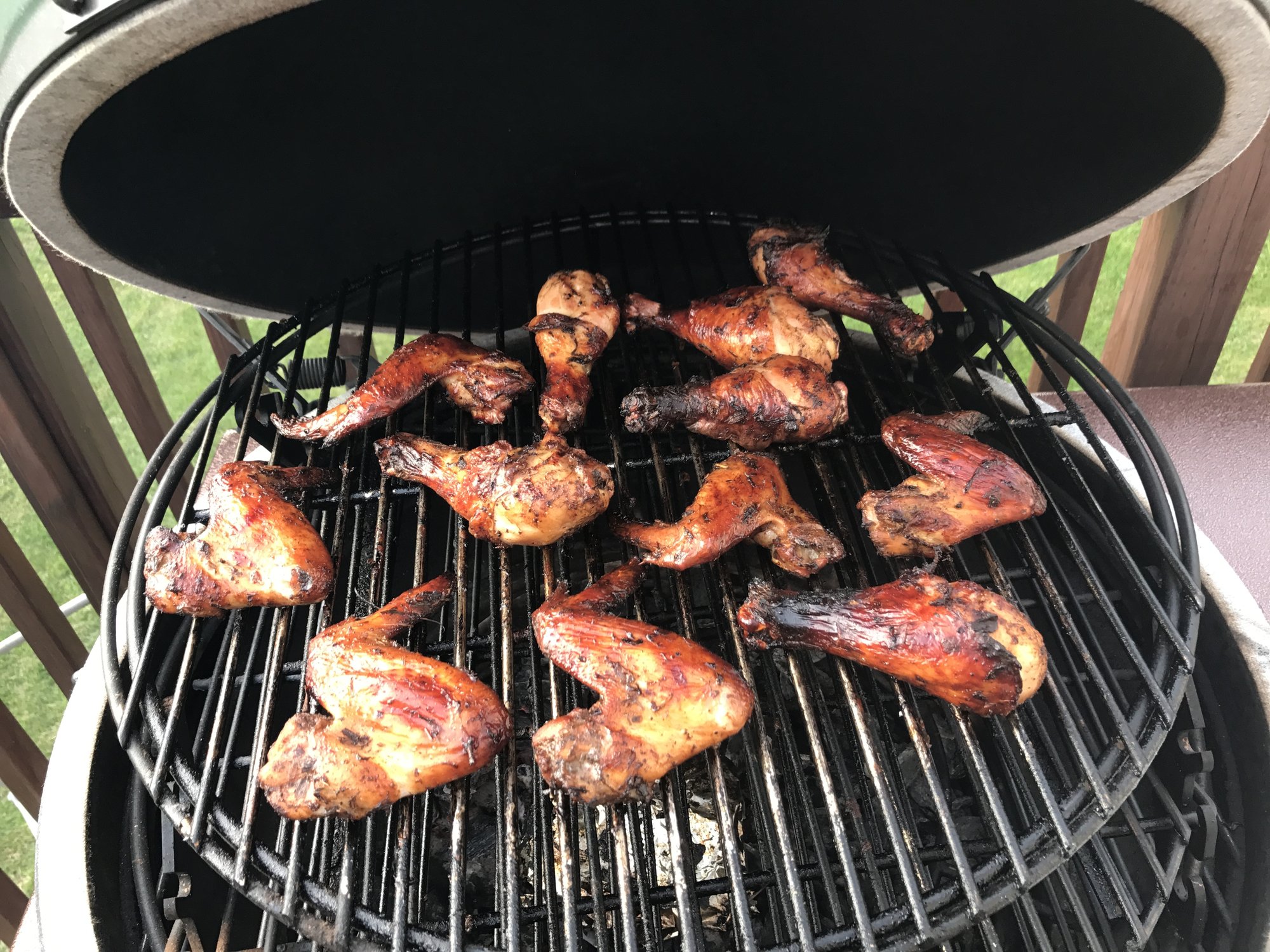 Marinated Purdue legs and wings using Spur Tree Jerk seasoning. Cooked raised direct with Pimento Wood chips at 350-375. This was the best Jerk Chicken that I have cooked in a while.