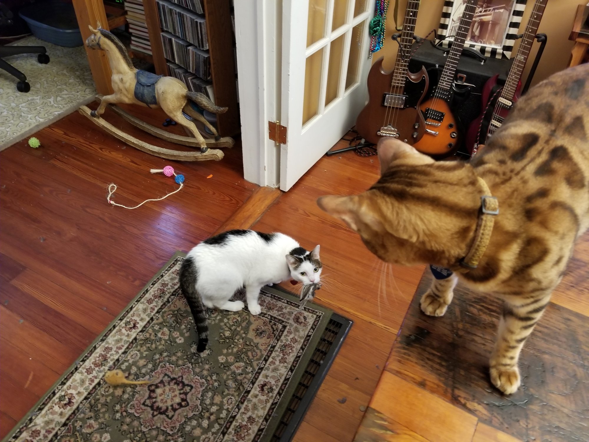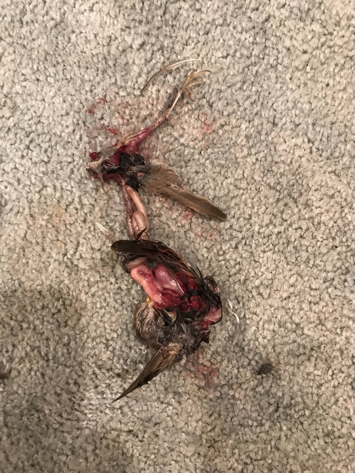 The Bengal caught and brought the bird in the house this afternoon.  Abandoned it.  Then the polydactyl claimed it and growled at all that came near.