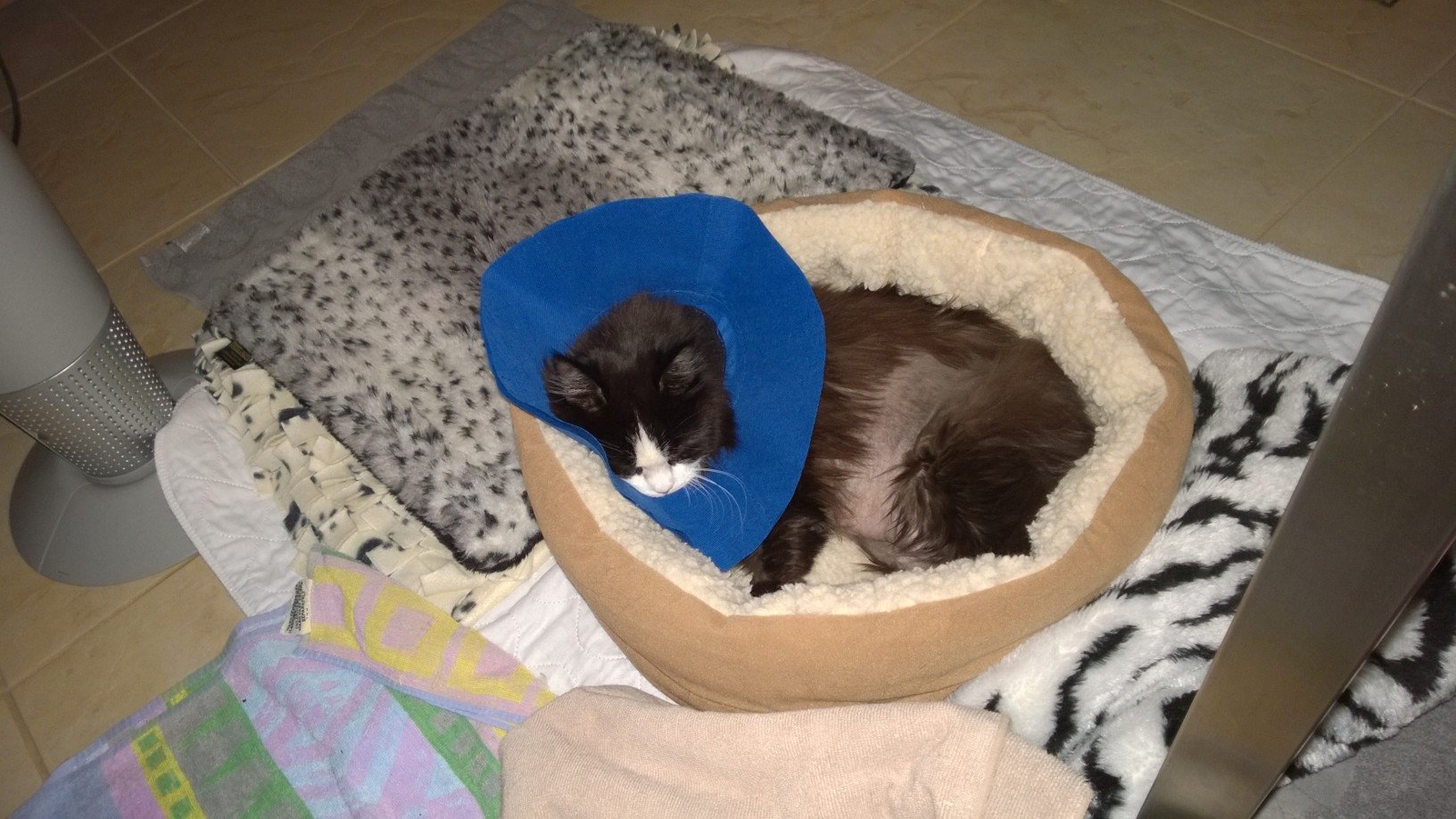 Our 16-year-old cat Katya had an extremely rare tumor usually only found in human kids and puppies. It and her kidney were removed when she was 14. She was miserable with the plastic "cone of shame" and I found flexible cloth ones. Better for cats and some snub-nosed dogs. Made her a padded room (kitchen) since she wasn't allowed to jump or climb.