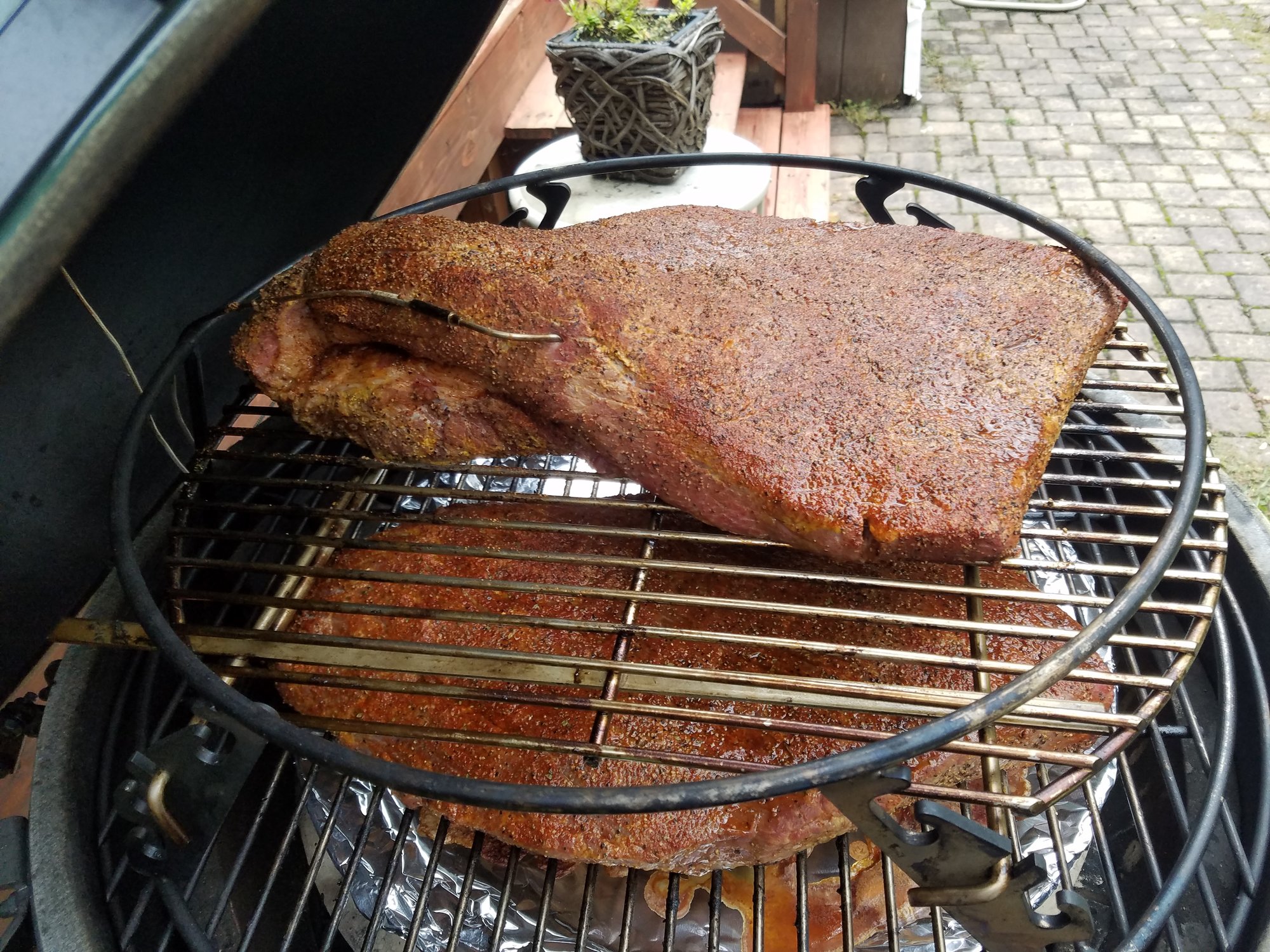 The good news is that you are not pressed for time and you will be fine either way. If it looks a little dry, then foil it. If it seems to be teaming with moisture, then don't. That's what I'd probably do.XXL BGE, Karebecue, Klose BYC, Chargiller Akorn Kamado, Weber Smokey Mountain, Grand Turbo gasser, Weber Smoky Joe, and the wheelbarrow that my grandfather used to cook steaks from his cattle