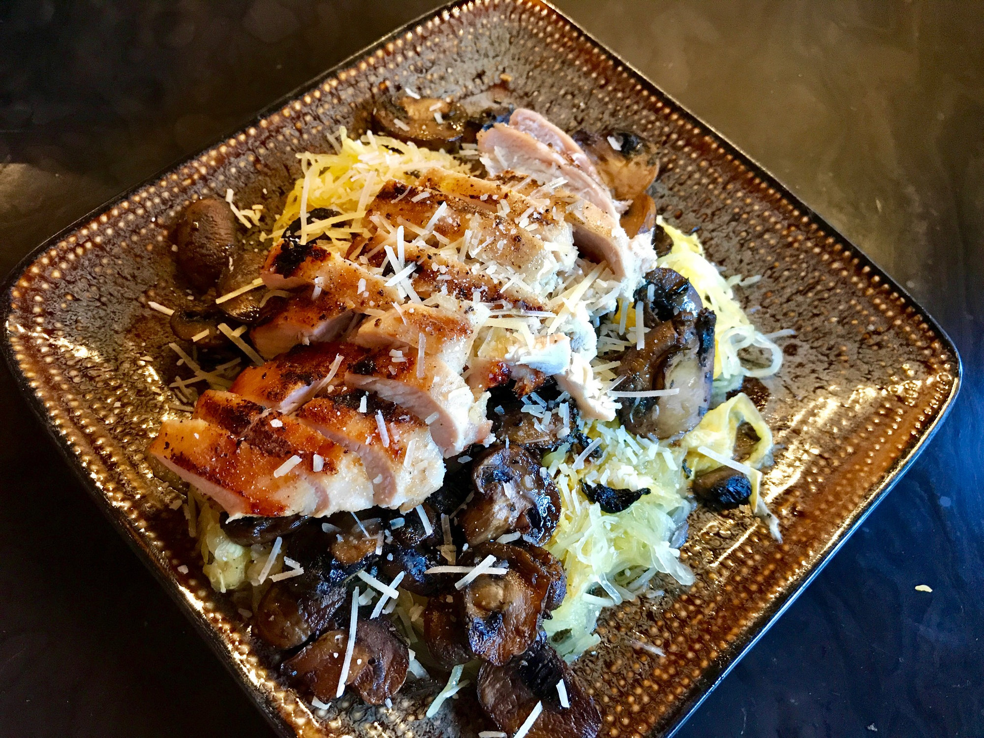 Spaghetti squash on the bottom and baby ports roasting on top.