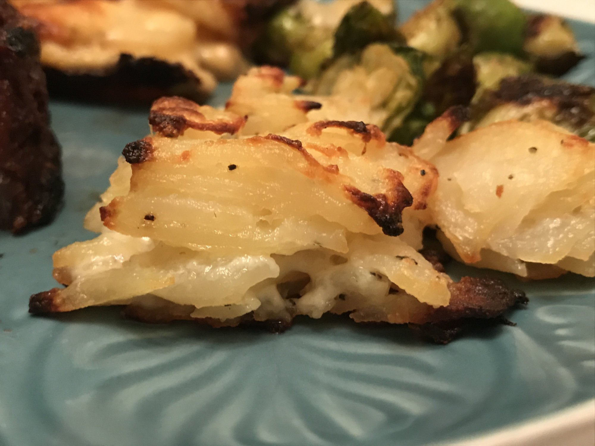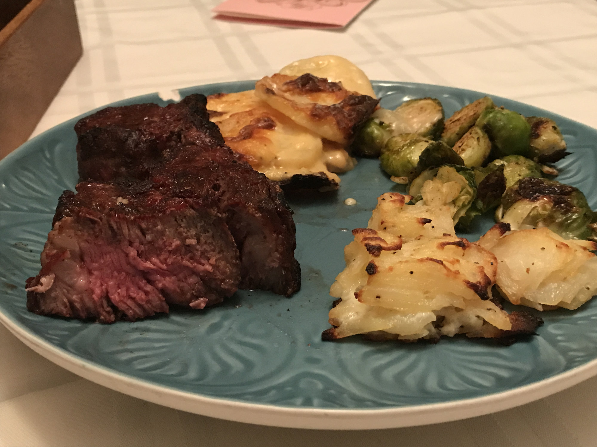 Cooked up some prime Ribeye Cap Steaks along with Nola's potatoes au gratin, brussel sprouts and an experiment with Mille-Feuille potatoes.