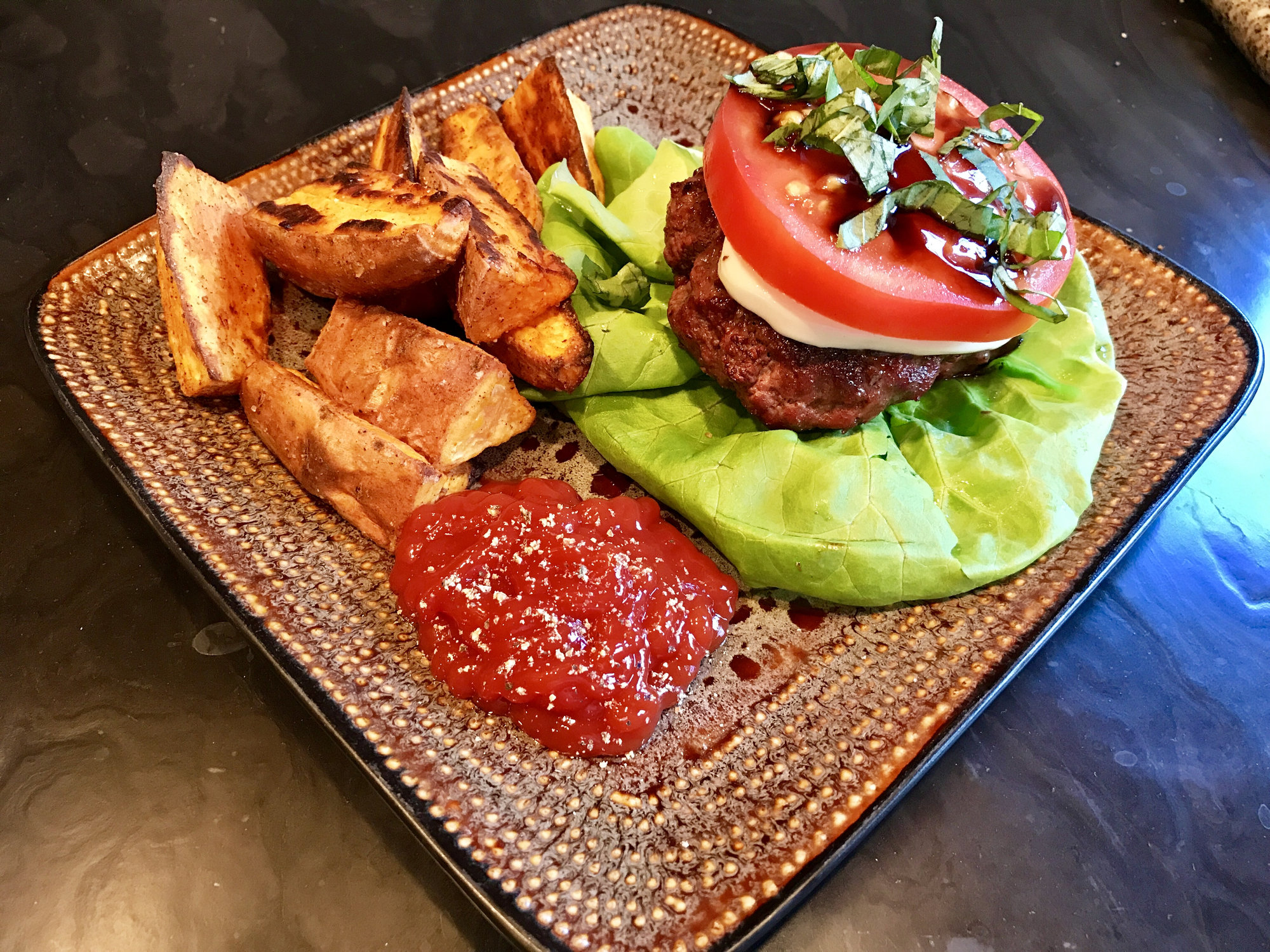 CI Caprese Burger and Sweet Potato Fries