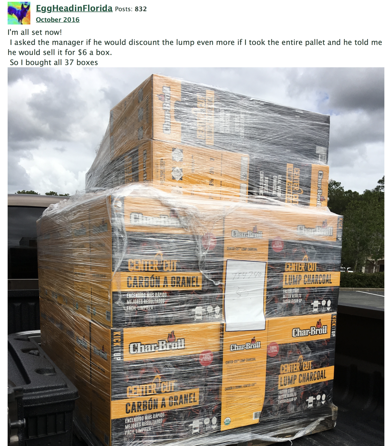 I cleaned out a local store lat year at $5 a box.EggHeadinFlorida said:I bought about 40 of these boxes last year from Lowe's for about $5.00 a box I think. They were on clearance for $11. I spoke with the store manager and made him the offer for the entire pallet. So far no issues at all with this lump. burn nice.