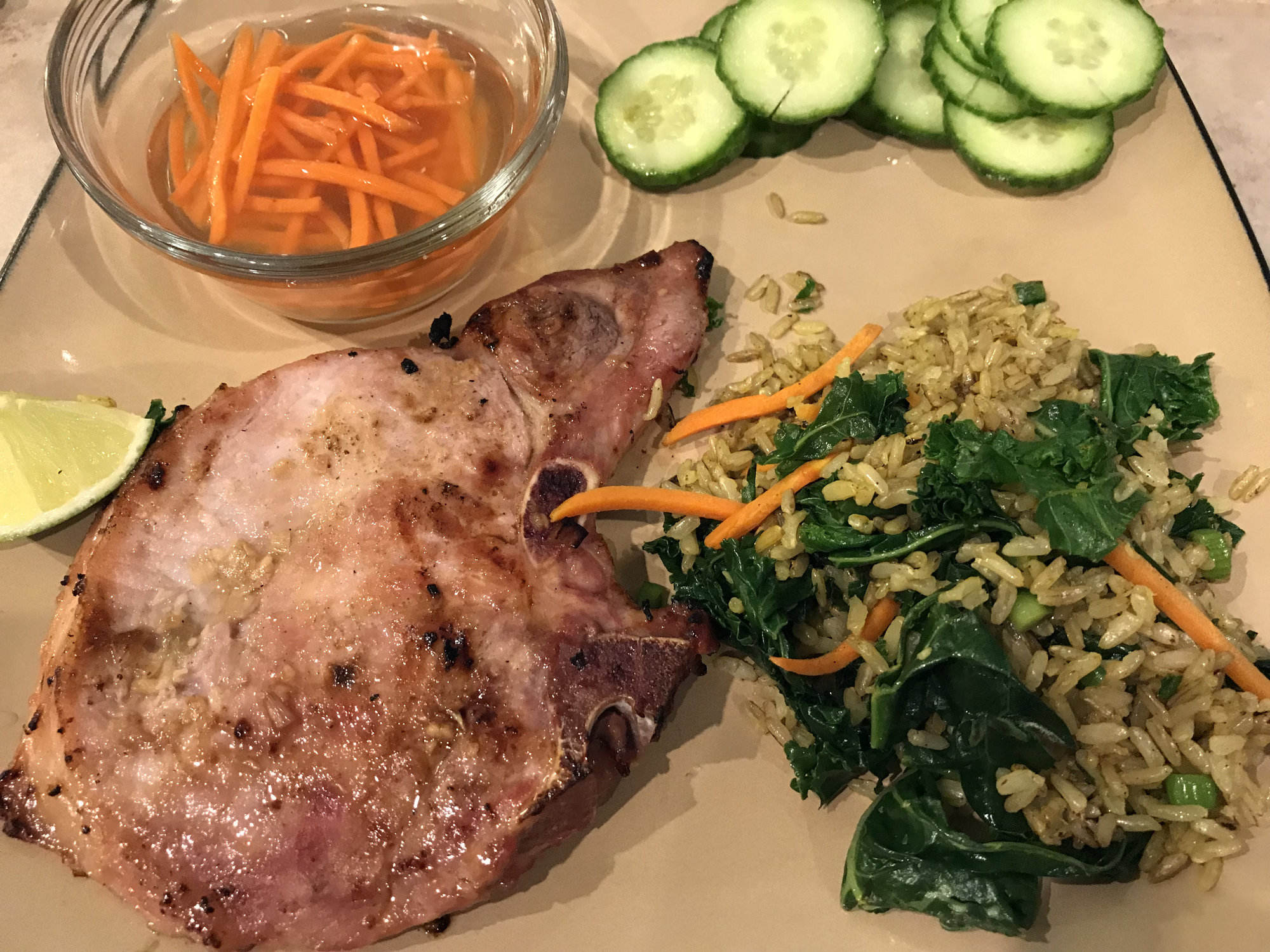 This turned out really well. Pork chops were awesome and the fried brown rice with turmeric, lime, carrots, scallions and kale was very different and good.