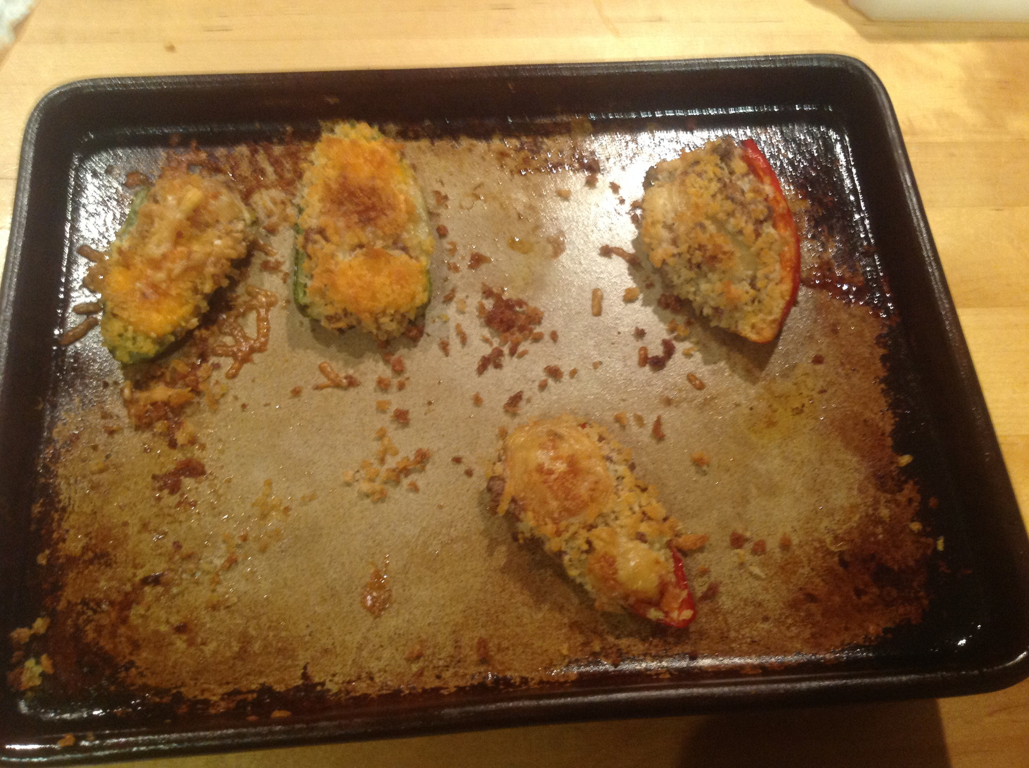 My wife came up with this tonight. Peppers cut in half, filled with a mixture of cream cheese and bacon bits, your favorite cheese on top of that and then covered with panko and sprayed with Pam. Add some garlic powder and aps. In the oven at 425, they came out nice and Chrispy. Our new favorite way for stuffed peppers. We ate some before the pic
