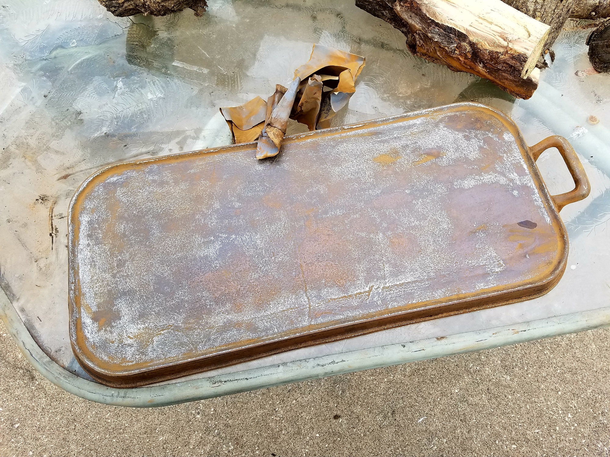 Griddle is a little roached on the bottom, but not warped, no cracks, or pitting on top. This thing is huge.