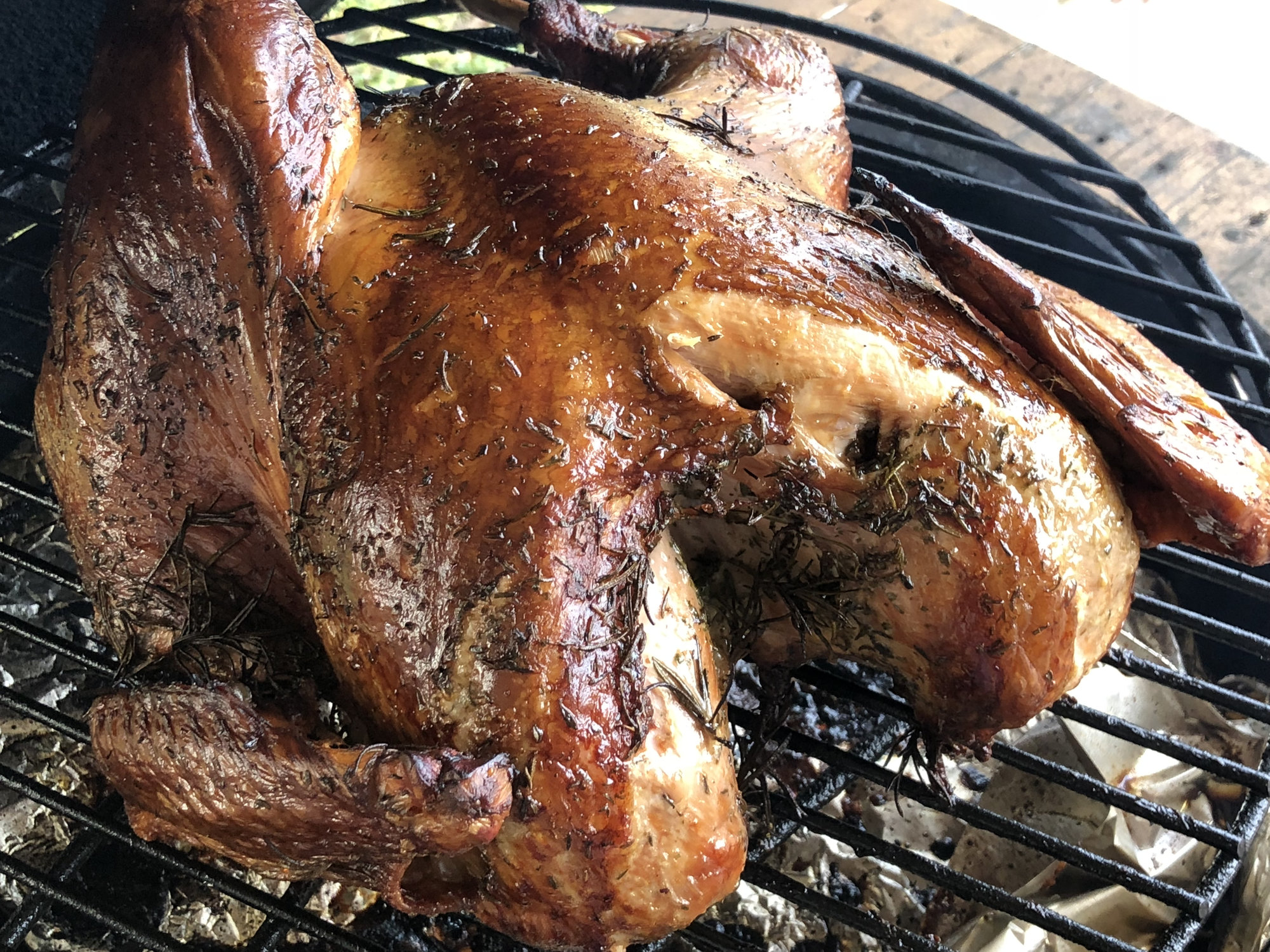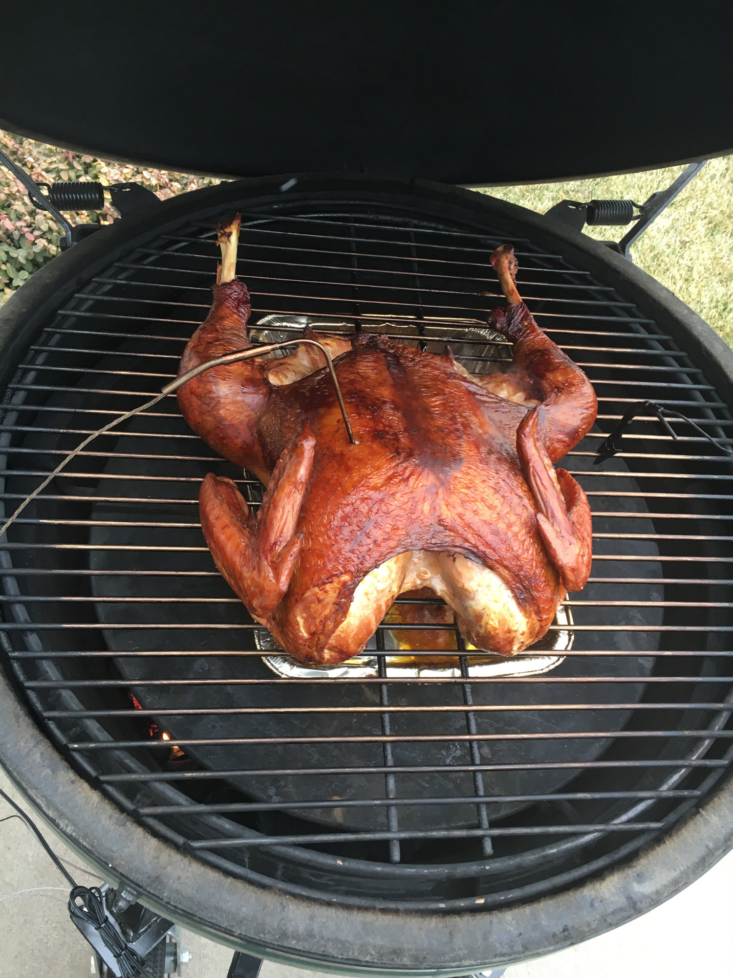 Thirteen pound bird, spatchcocked and with Simon and Garfunkel rub. Amazing gow how fast a turkey cooks when spatched.