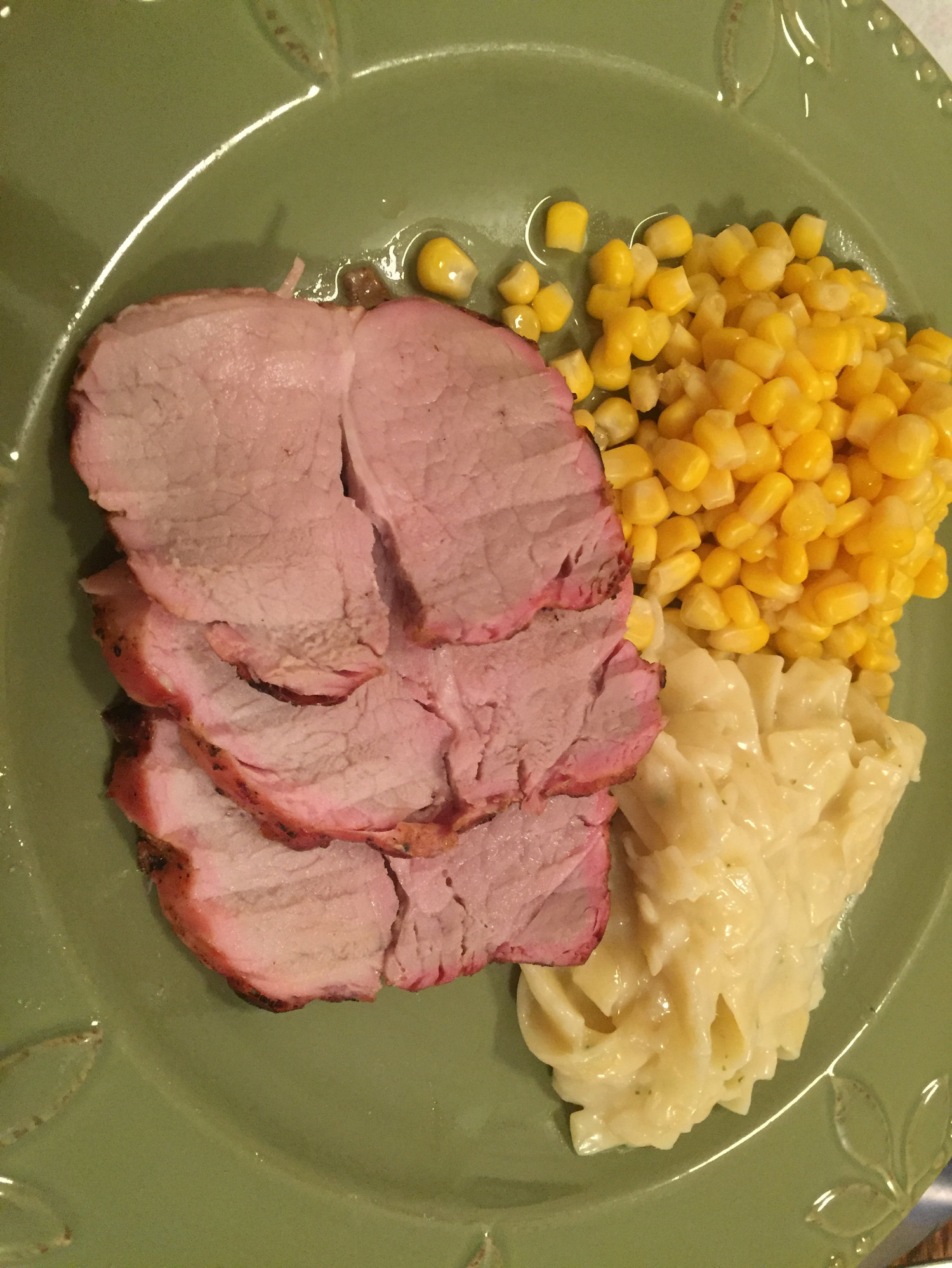 oldest wanted pork t. So, trussed two end to end and rubbed with Dizzy Pig Red Eye Express. Cooked it raised direct. Added some butter noodles and can o corn. Pork cooked to 145 and rested. Tender and delish. Nap time!