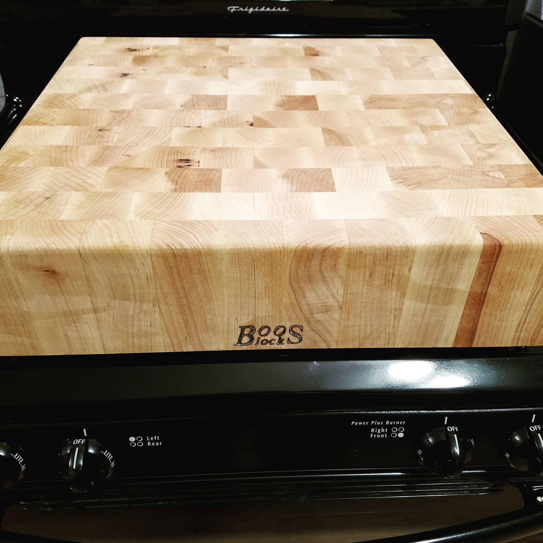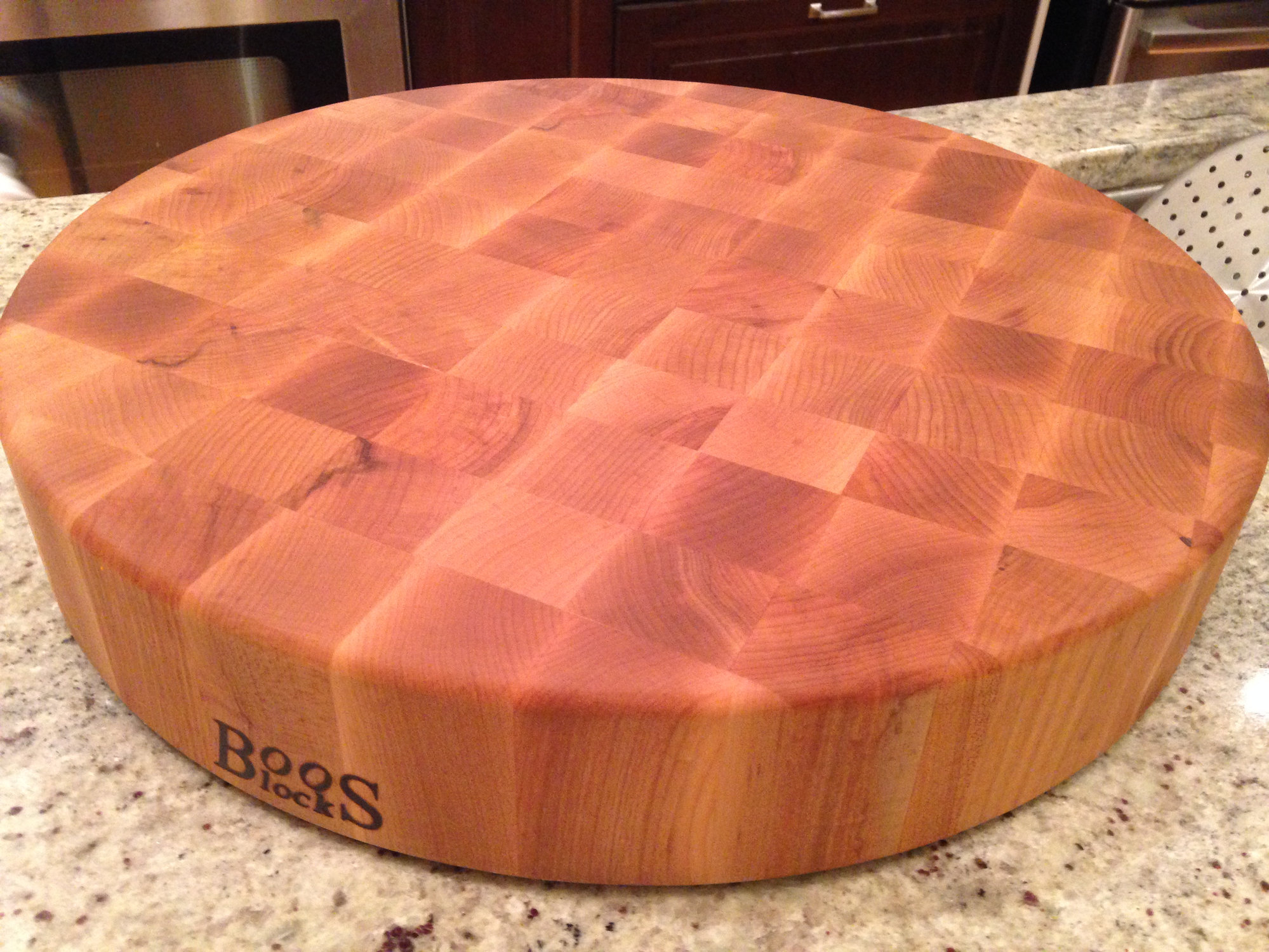 Beautiful. I have the round maple endgrain block in a similar thickness. It could be my eyes or your camera, but your board looks dry (as it's very light in colour). Have you oiled and then applied a wax/cream to the board? If not, I highly recommend it. The board will be exceptionally thirsty the first few weeks and months.