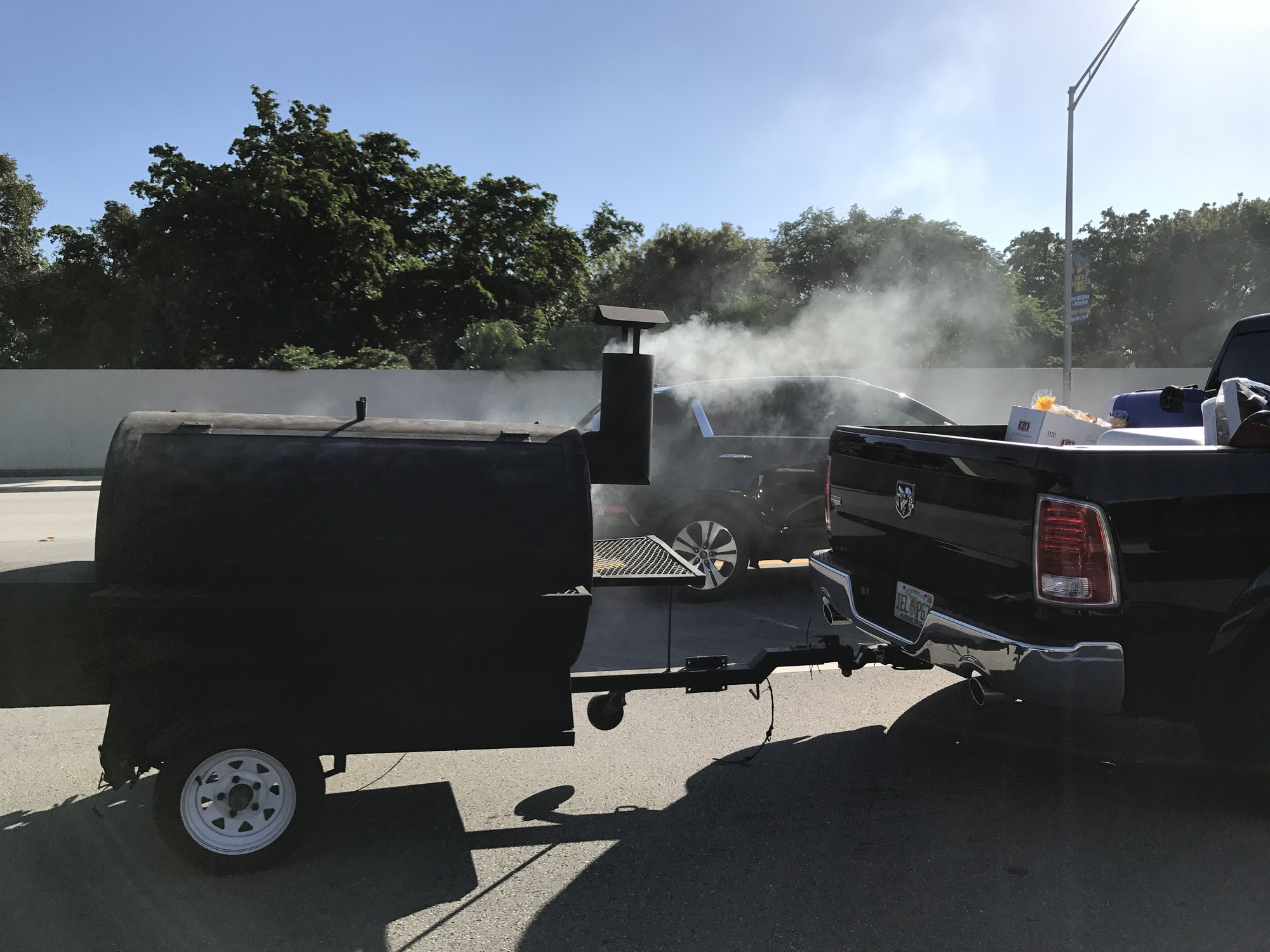 This past season (Go Canes!) before the Notre Dame game I saw a pickup towing a lit offset smoker.. We were waiting for the stadium gates to open and I start smelling some smokey awesomeness. I look over and see this. Dude was cooking all sorts of chicken and pork in there.
