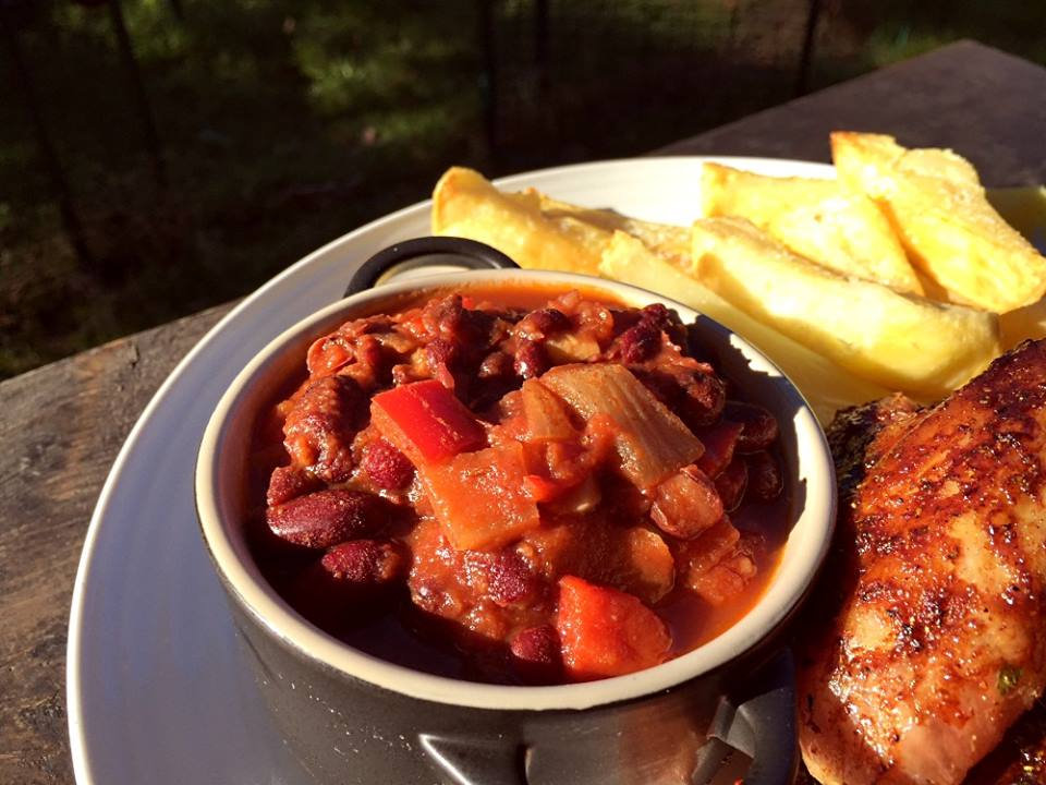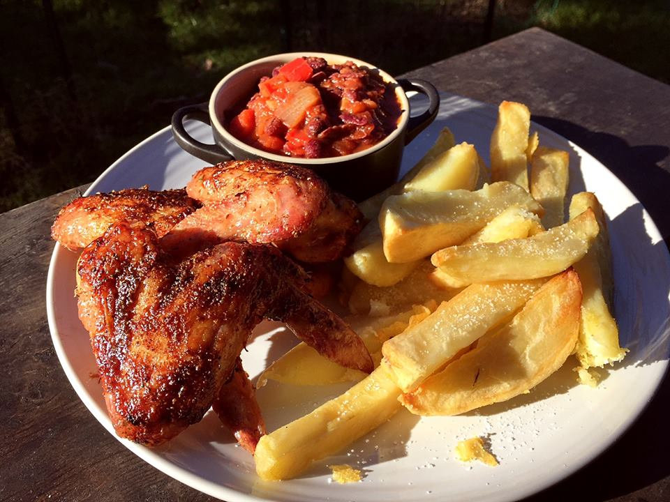 Title says it all really, I used an Indian spice mix and a s/s tamarind sauce (last few mins), utterly delicious. Ramos potato wedges and some smokey chipotle beans left over from the previous day's cook.