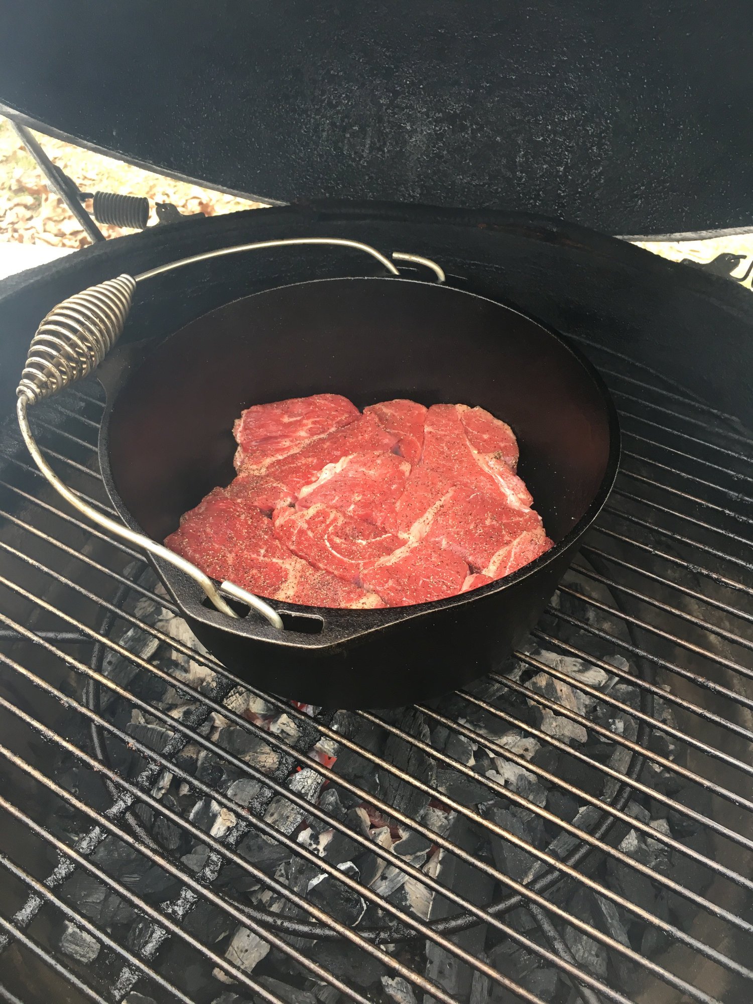 Looks great! I have an enamel Dutch oven I frequently use for pot roast, never thought of doing one in the CI Dutch oven on the egg. Do you cook it with the Dutch oven lid off to get smoke on it?XL Central Ohio