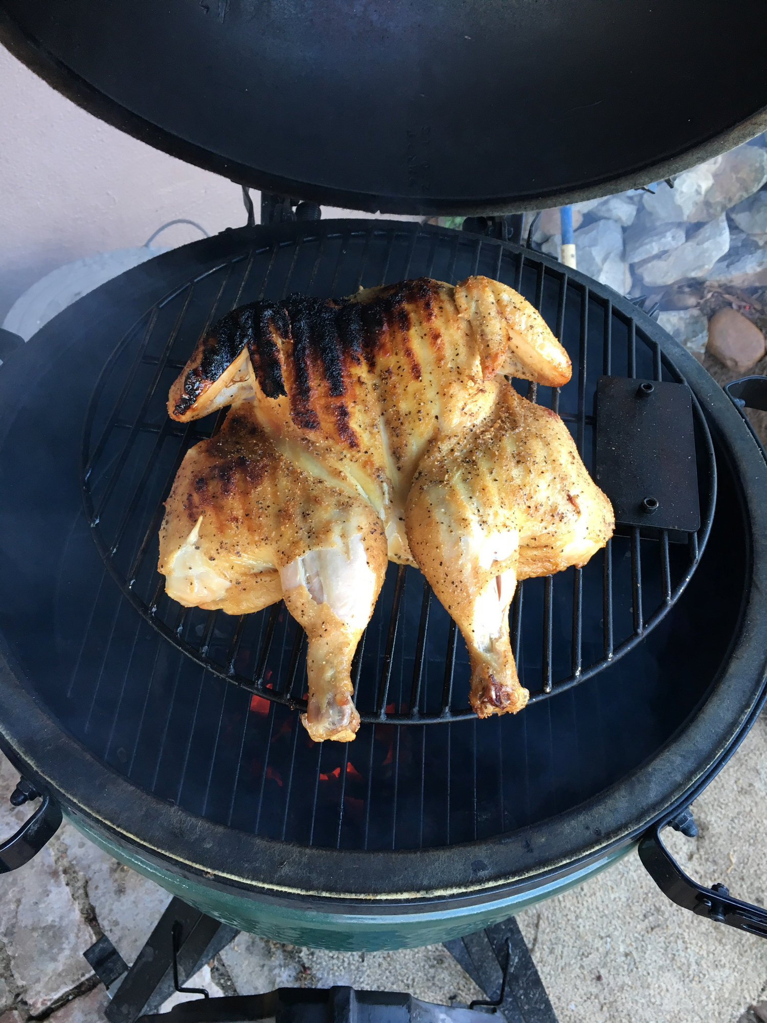 @Photo Egg Dome temp was 400 when I put it on, with legs toward the hinge, so the hot spot was actually toward the front. Didn’t touch the settings when I put it on, learned that lesson years ago. I will say, it was a damn good chicken!