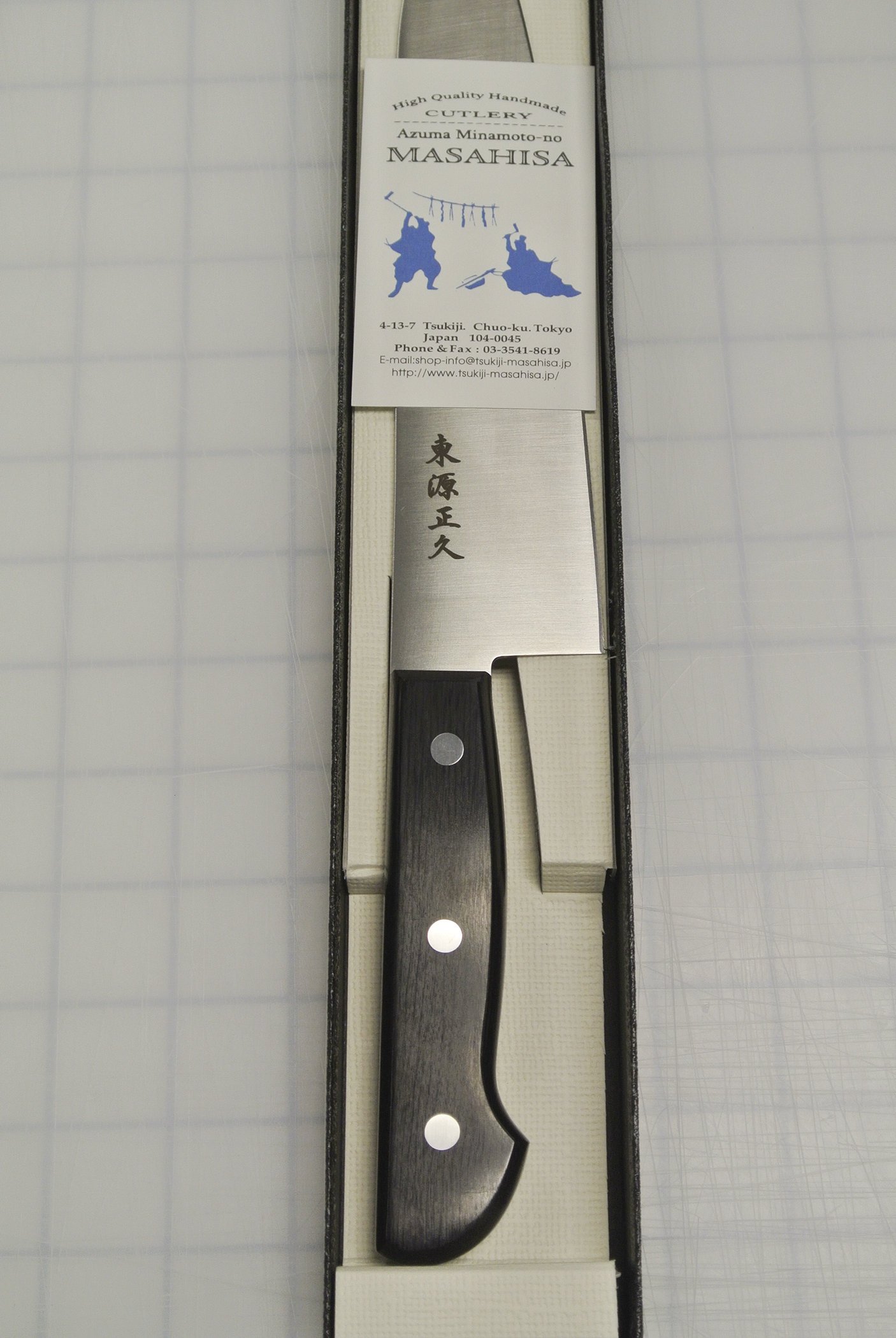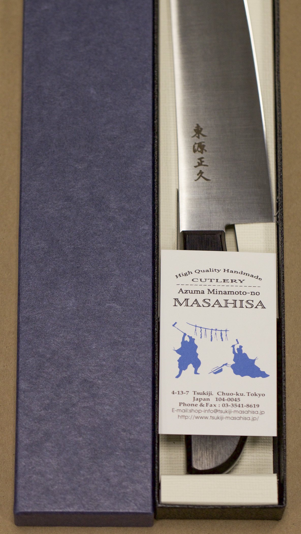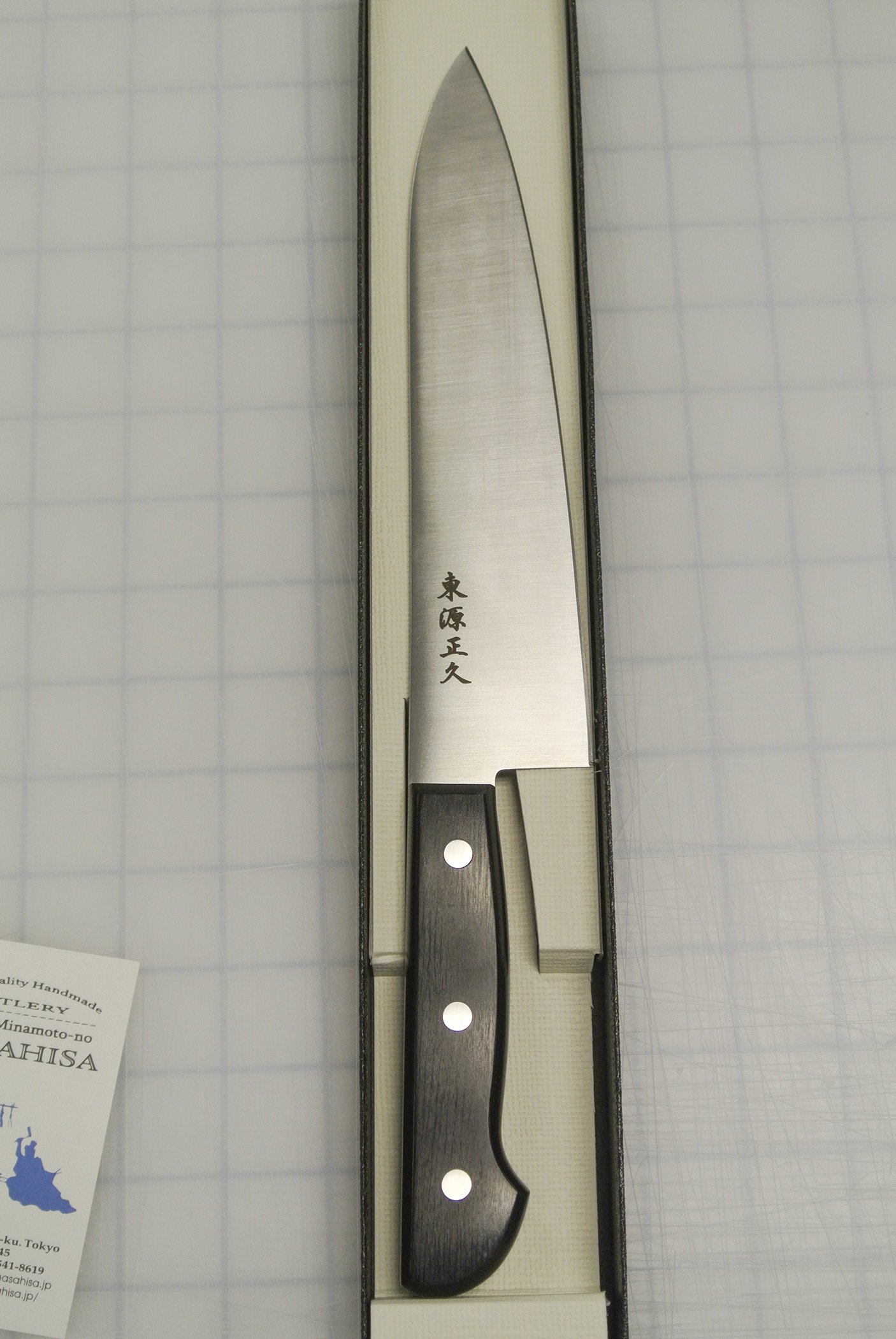 I prefer the more traditional handle over this western style but it will be a great daily user. Basic stainless but I have no idea the grade of steel. Out of the box it will easily shave arm hair. Right at $100 for this 210mm.