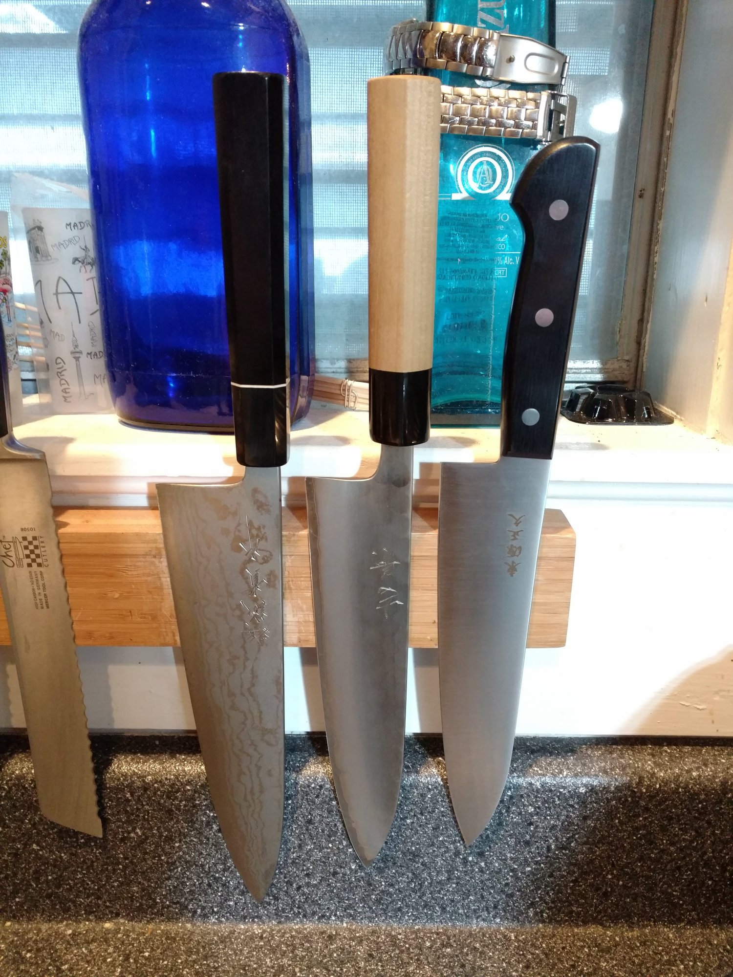 I will keep the new knife on the magnet block but the 2 others will go back into the cabinet.
