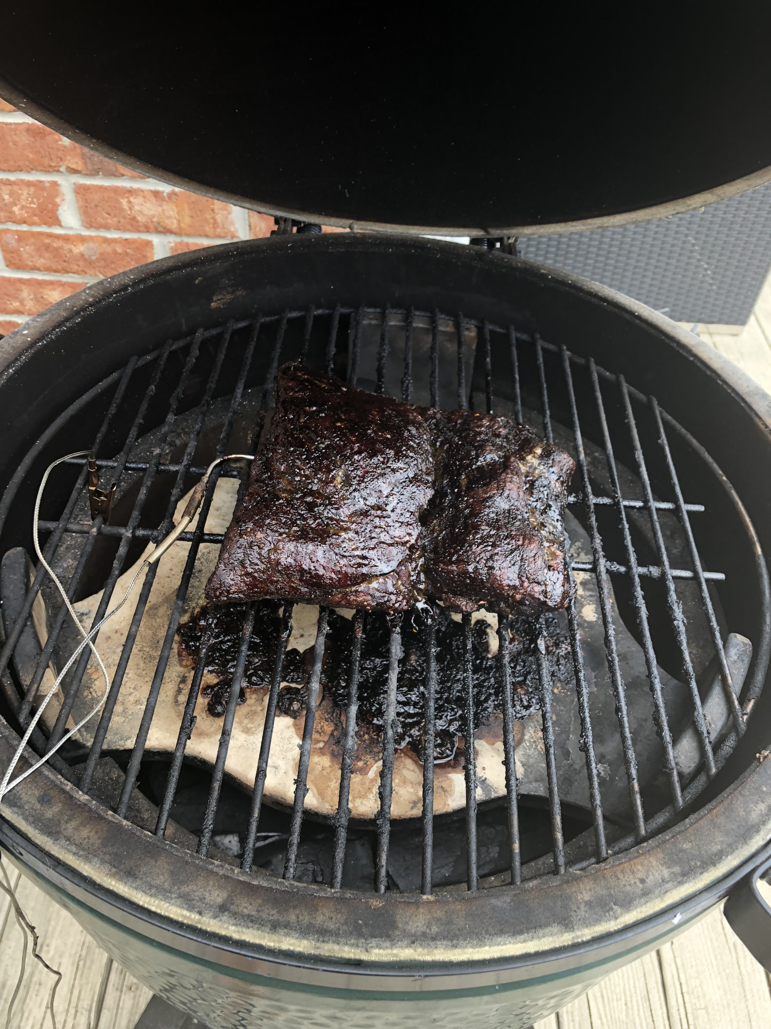 Good looking cook, nice job.  Tip for next time put in a disposable drip pan or make one out of H/D foil.  All that grease on the plate setter will eventually have to run off into the coals for a nasty grease fire that would ruin that great piece of cow.  Plus keep the plate setter clean.  I just use foil.