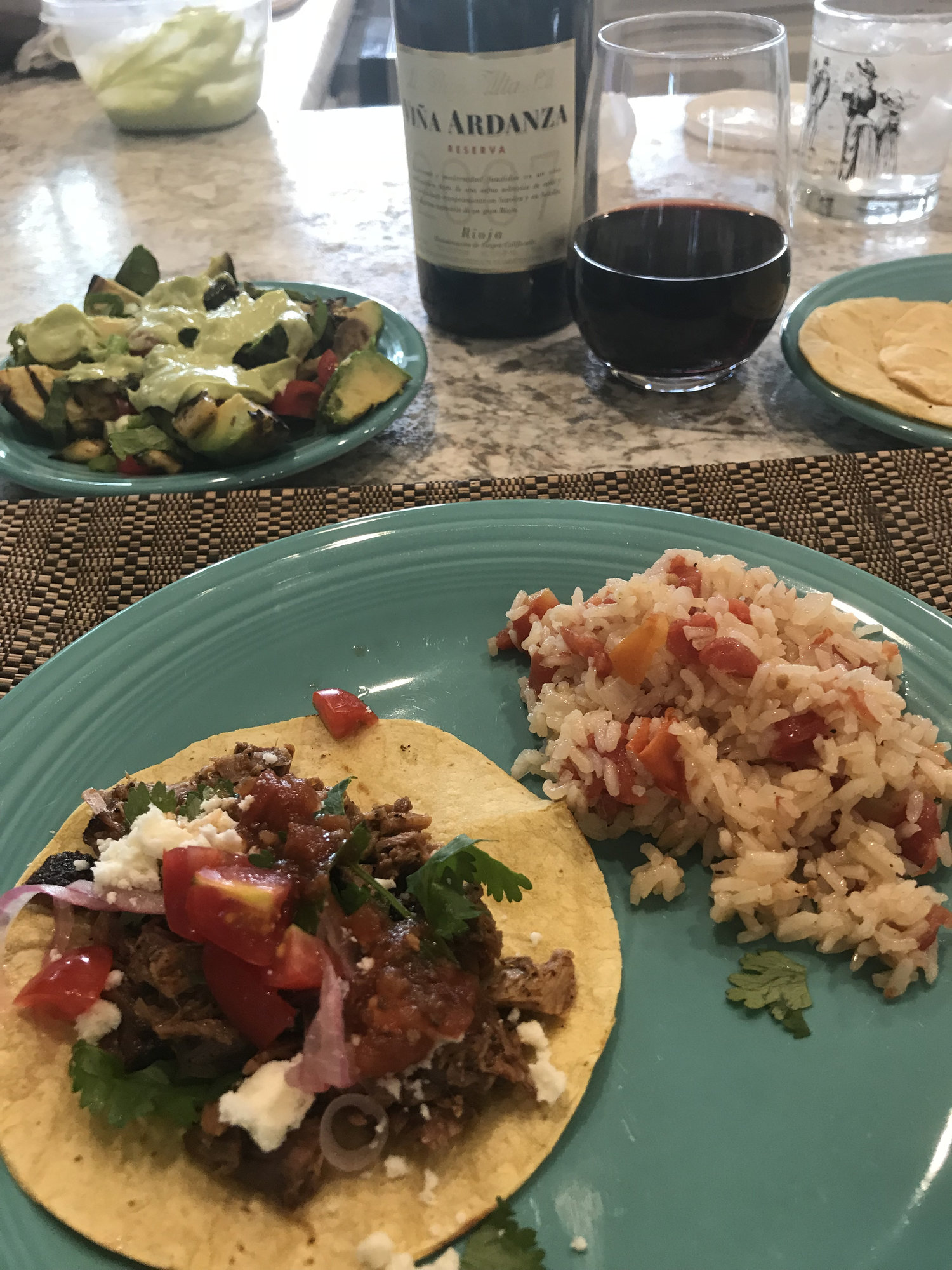 Leftovers. Pulled pork taco with pickled onion, tomato, Mexican farmers cheese. Wife’s world famous Spanish rice and grilled avocado salad (needs work but will be xclnt by summers end) inspired by @parkctex. Wife swore it was one of the best tacos ever, used Penzeys Mexican Now  with some chipotle.