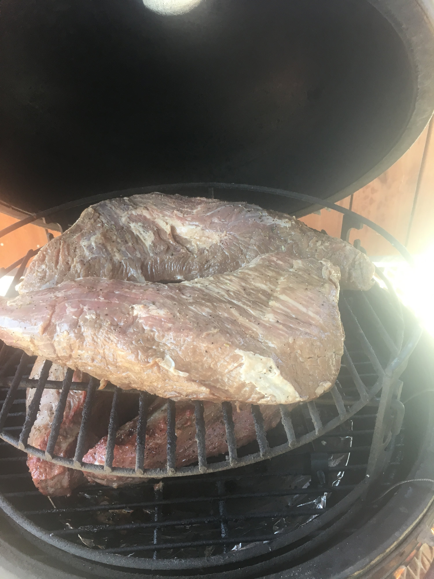 Tri Tip on the egg. Put the 2nd two on 1/2 hour after the first, o I would have time to slice. Sorry, no sliced pics! Too much going on, people