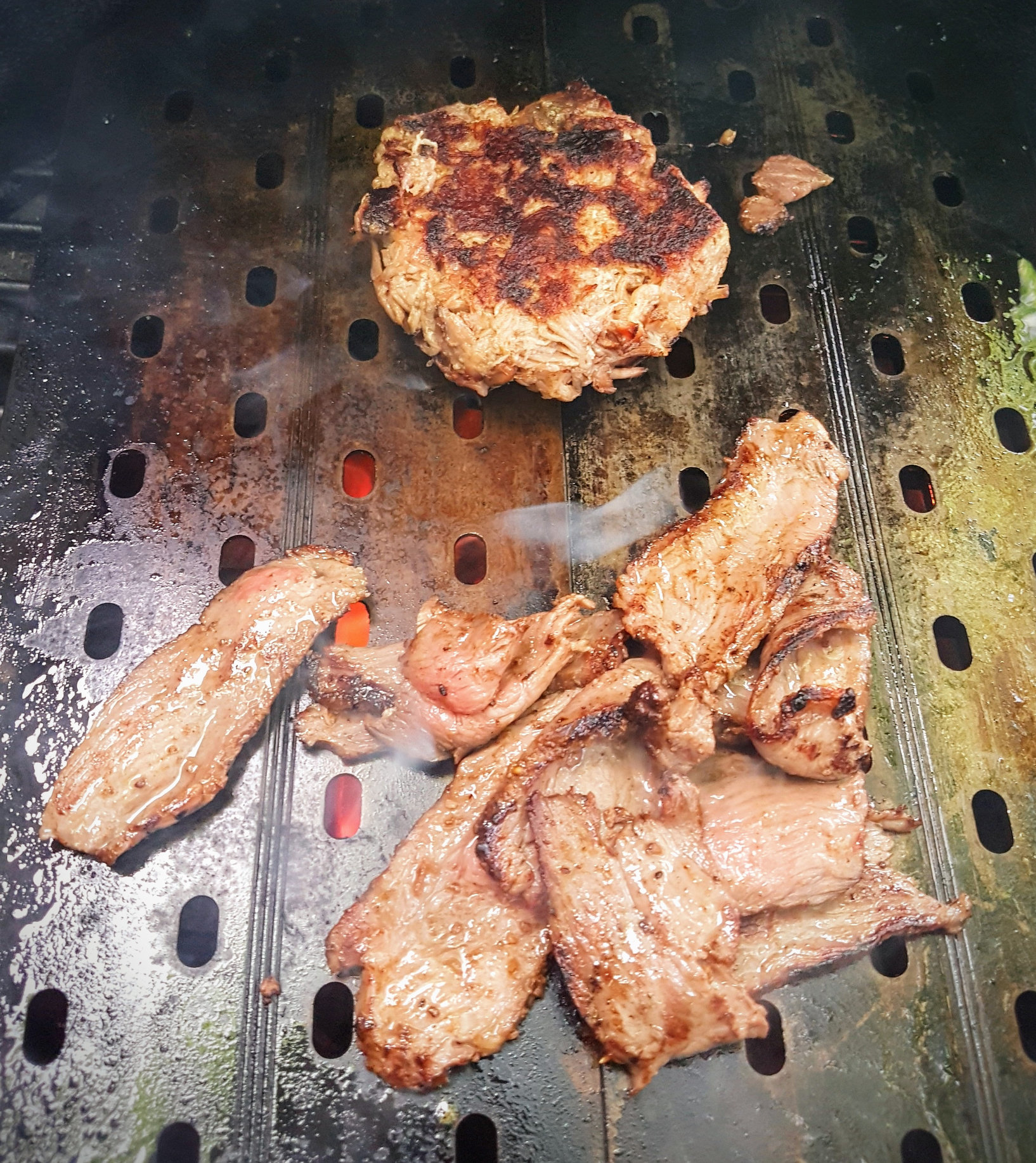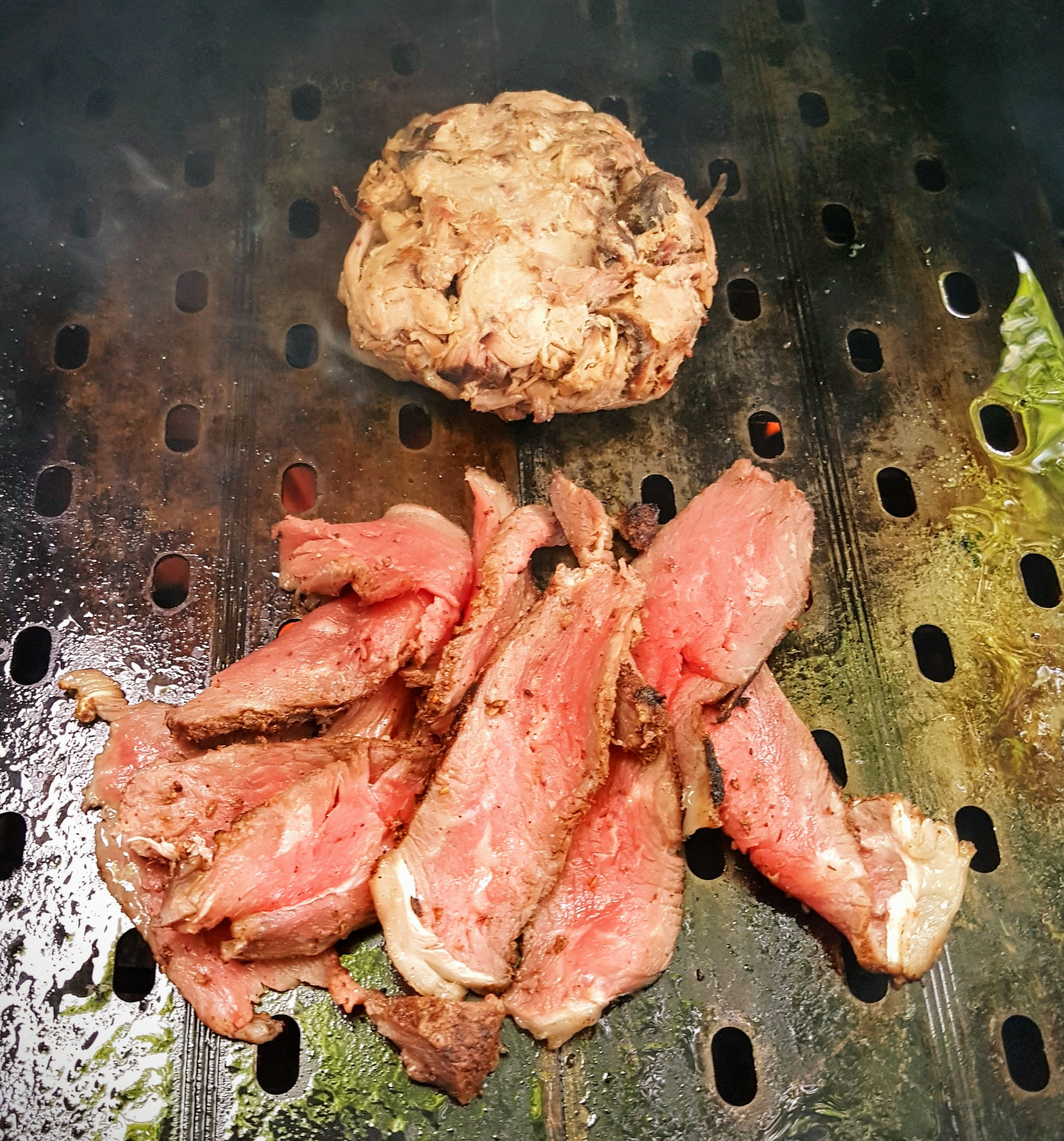 Next some previously reverse seared DP Molé strip loin and a rhubarb pulled pork patty.