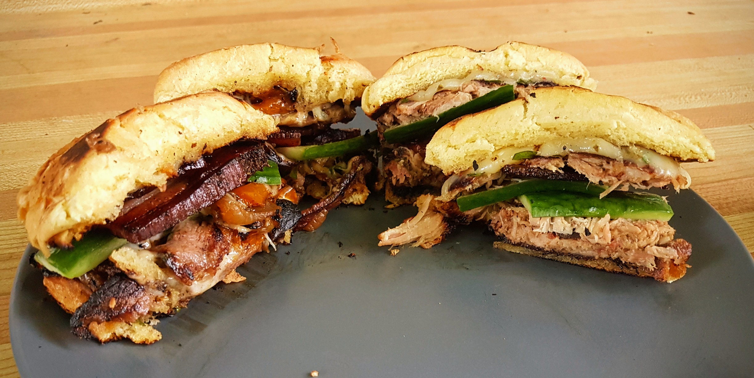 Got hairy after this, I let the heat get away from me (forgot to close bottom vent so it got up to 600+). Grilled some garlic buttered buns and also some mushrooms/onions/yellow peppers as well. Melted jalapeño jack over both meats with some basil from the garden. Also had some quick cucumber pickle I made earlier.