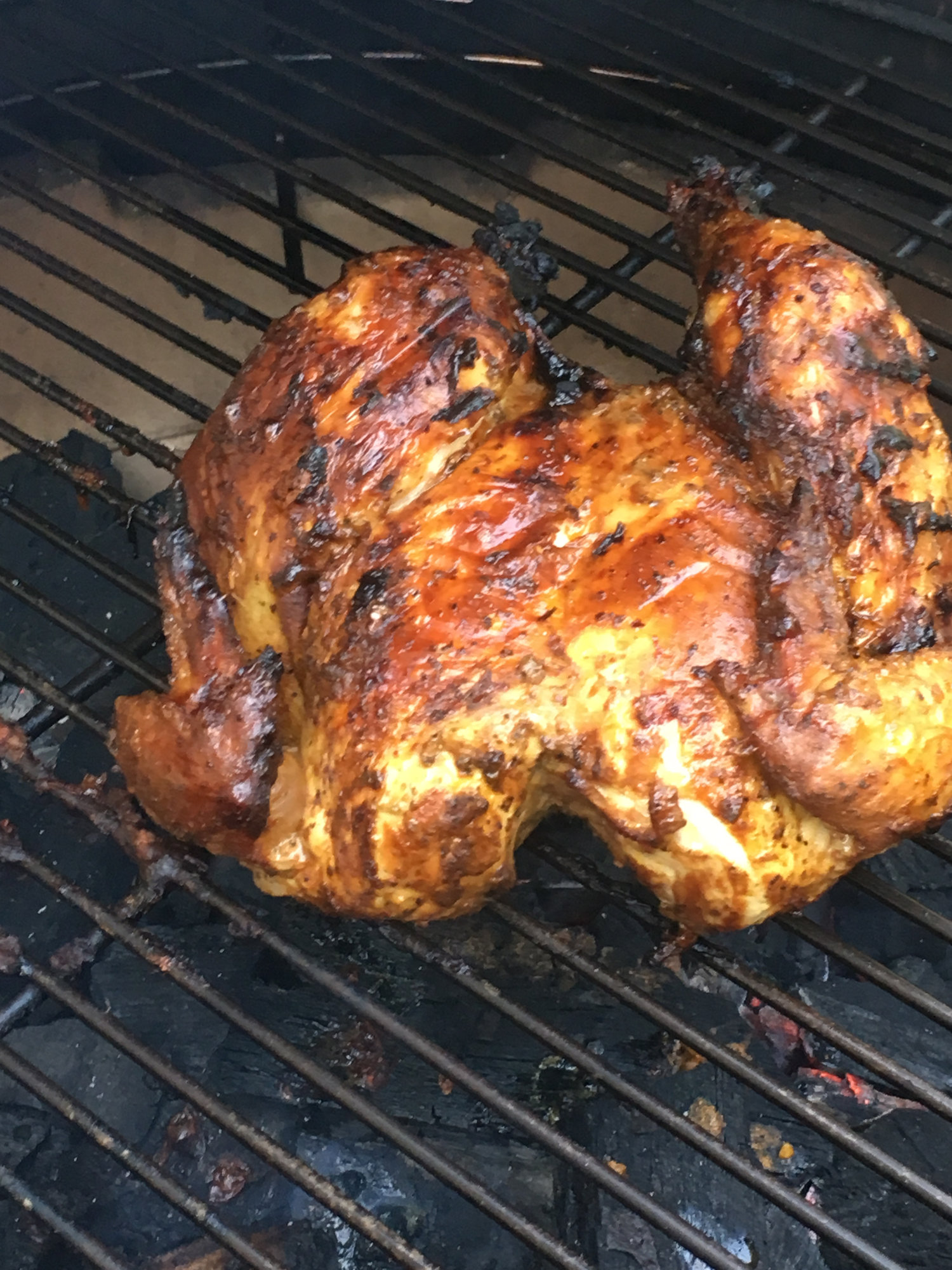 I bought a few jars of spice mixes at a local Latin supermarket, spatchcocked an organic bird, threw in some cherry and pecan for color and smoke. Raised direct about 375. So easy and delicious I don’t think I’ll ever cook chicken indoors again