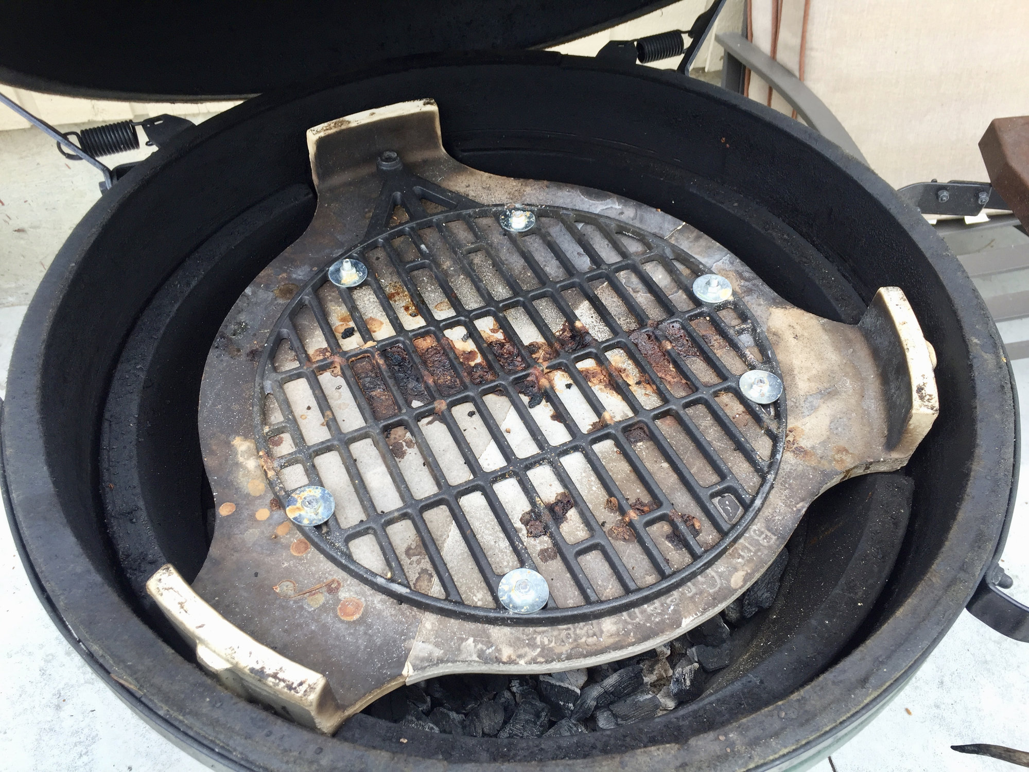 Found my old fire pit cooking grill, submerged the broken pieces & drilled them out for 1/4-20 hardware. Bolted it up with the grill as the brace and then took the torch to burn off any possible machine oil on the hardware.