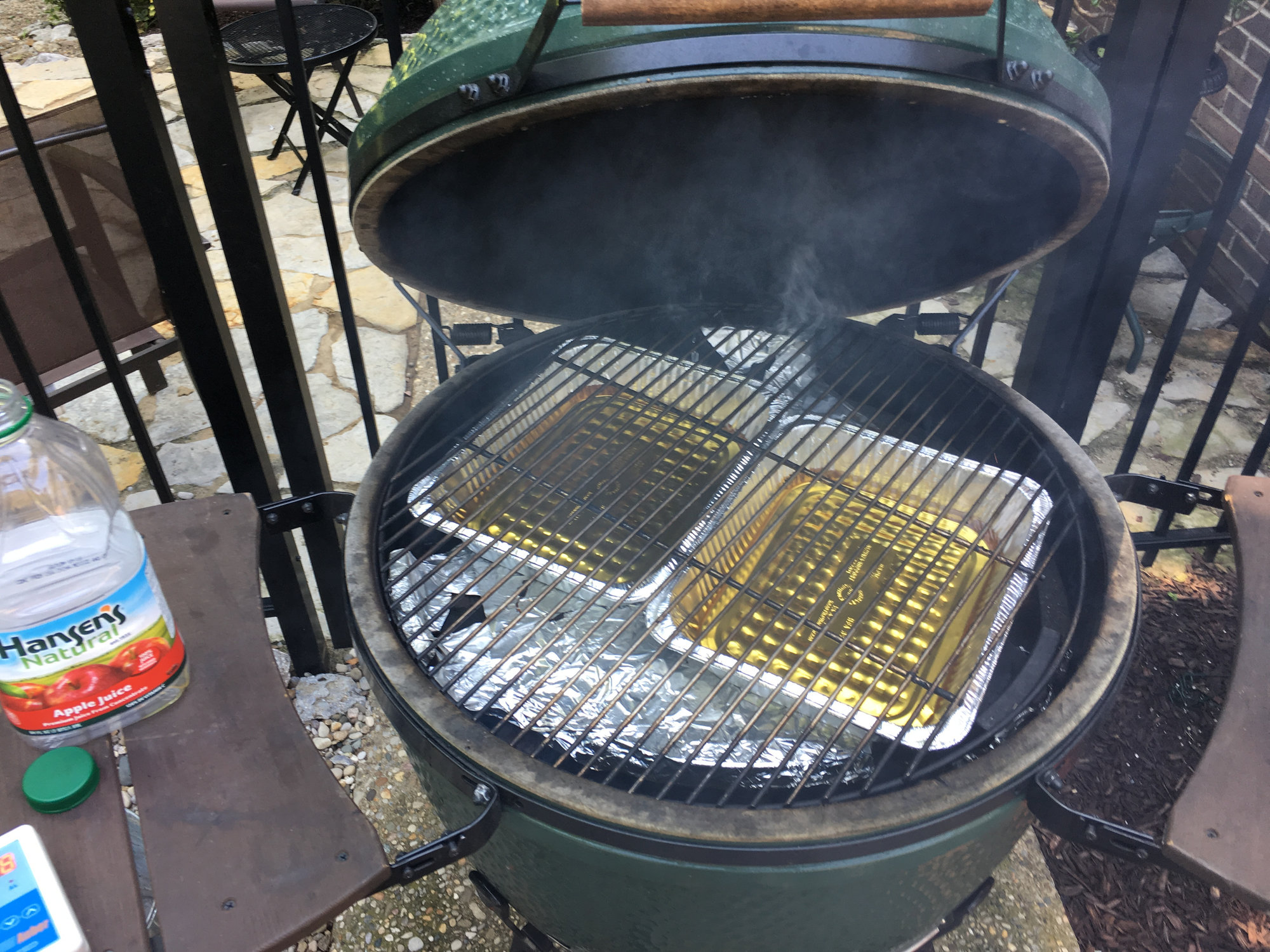 If your looking for advice, I will say this. Ditch the pans full of apple juice, or any other liquid for that matter. The egg holds moisture with out any help. And raise the temp a little. 250 to 275 will not hurt a thing and will save you some cook time. Personally I use to 300 to 325 and have excellent results. Otherwise, they look great.