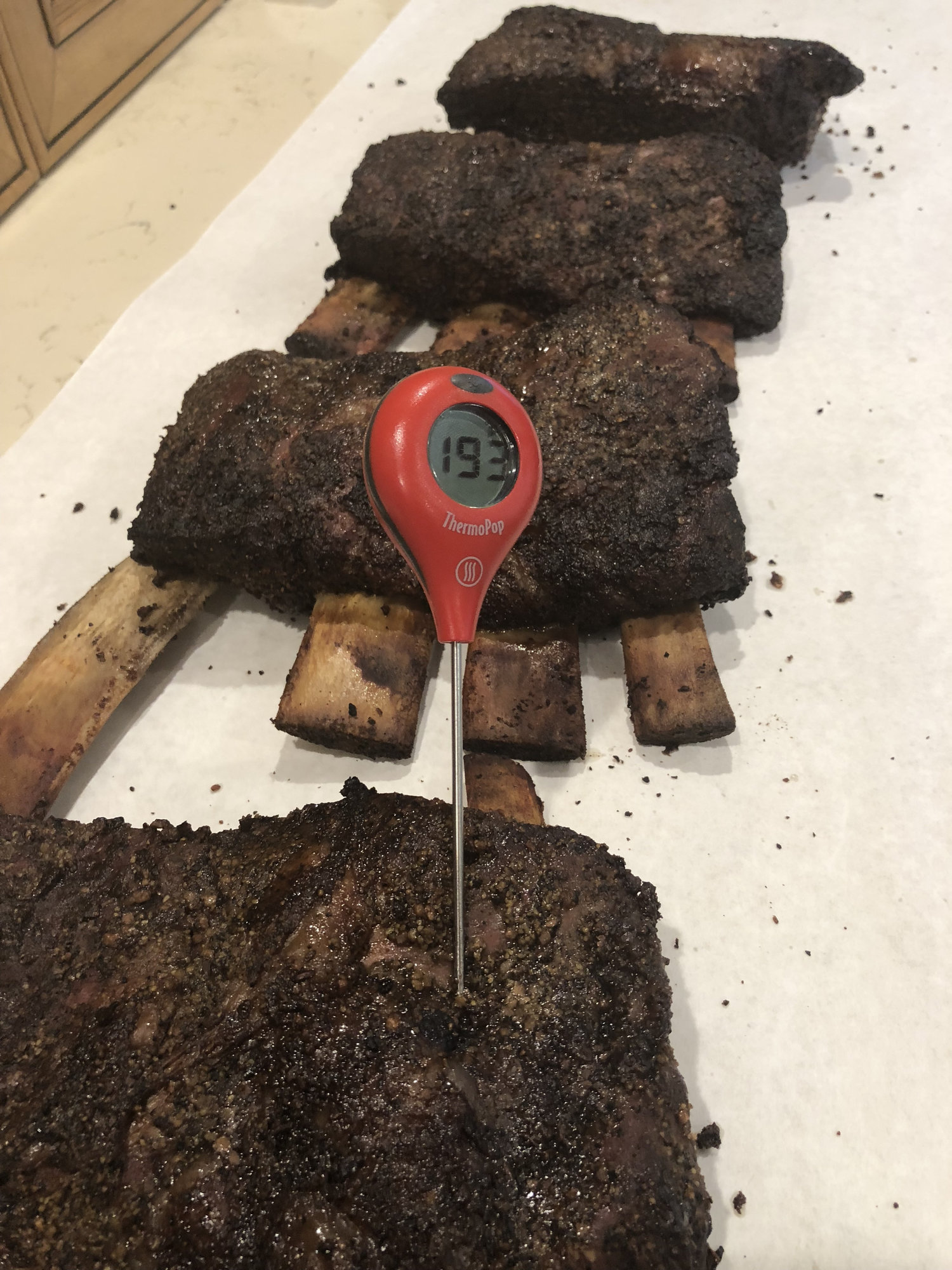 OK so I pulled the beef ribs and have them on the counter cooling for a bit before I wrap in through in a pre heated cooler the ranged form 193 - 210 IT and they all probe like buttah believe it or not the 193 is the softest and I loss a bone handling it