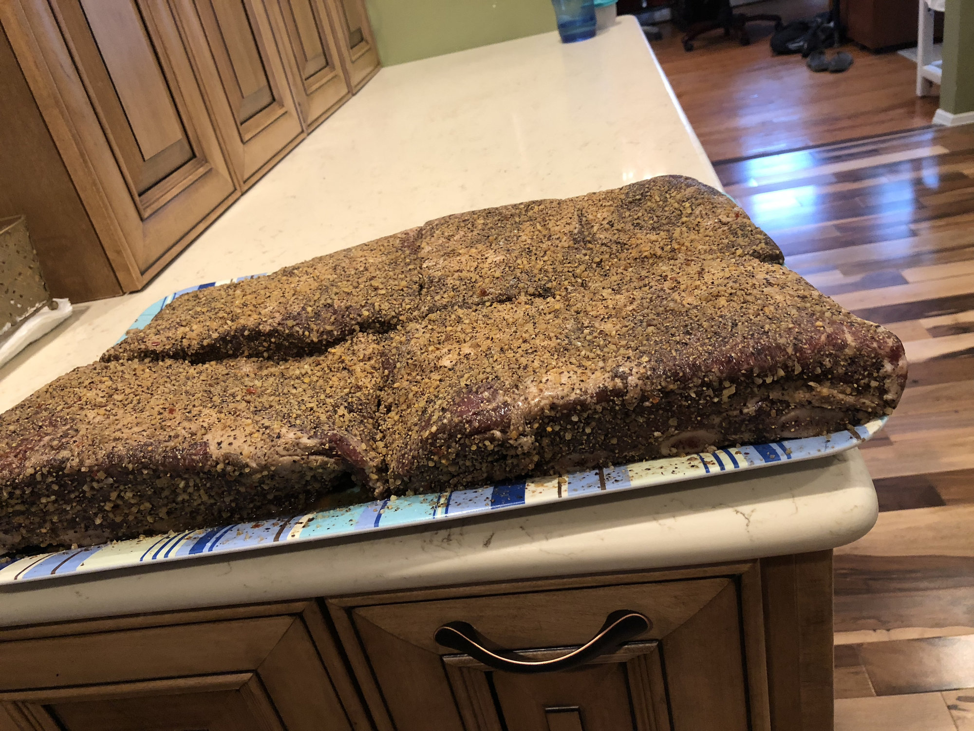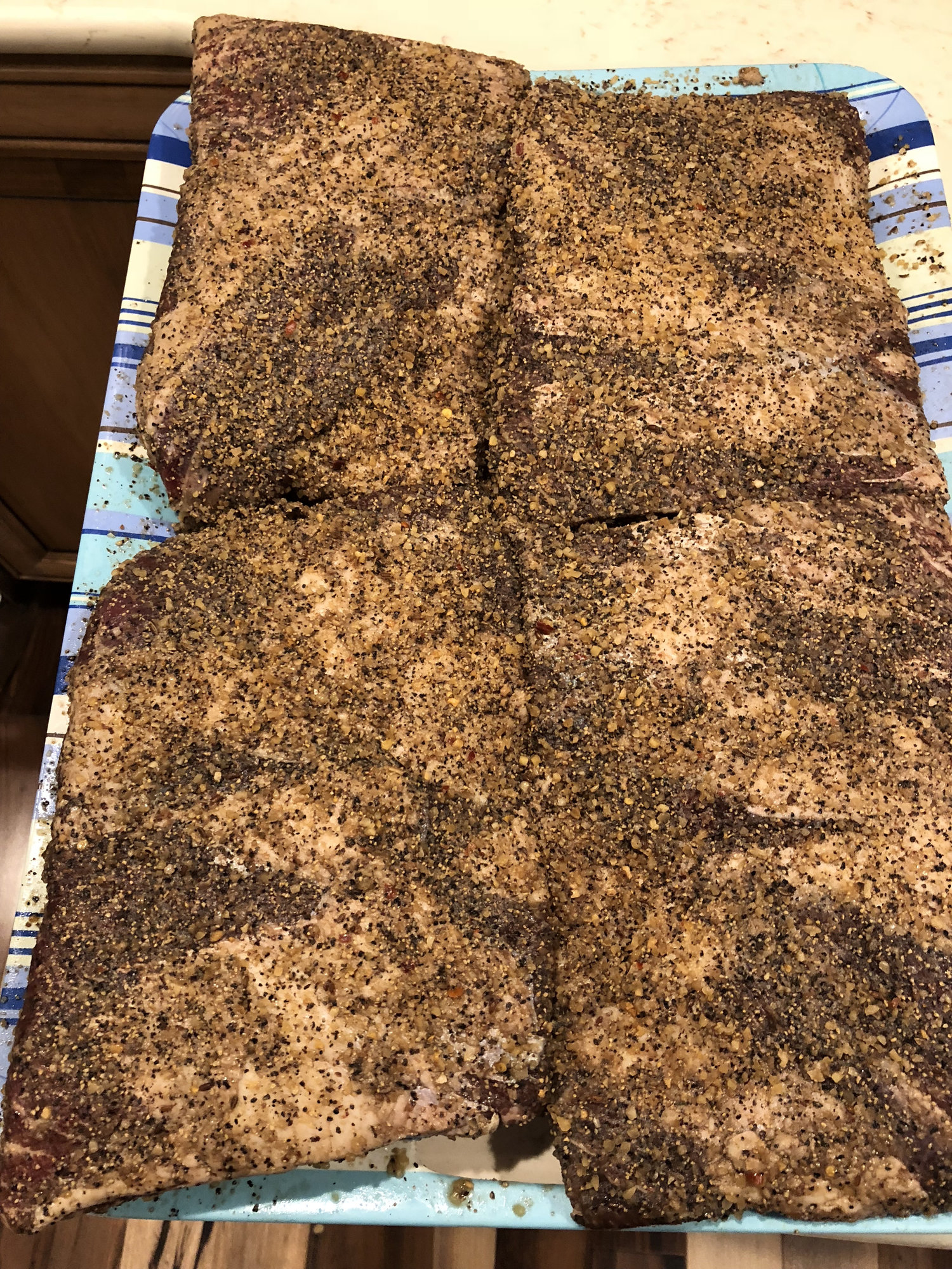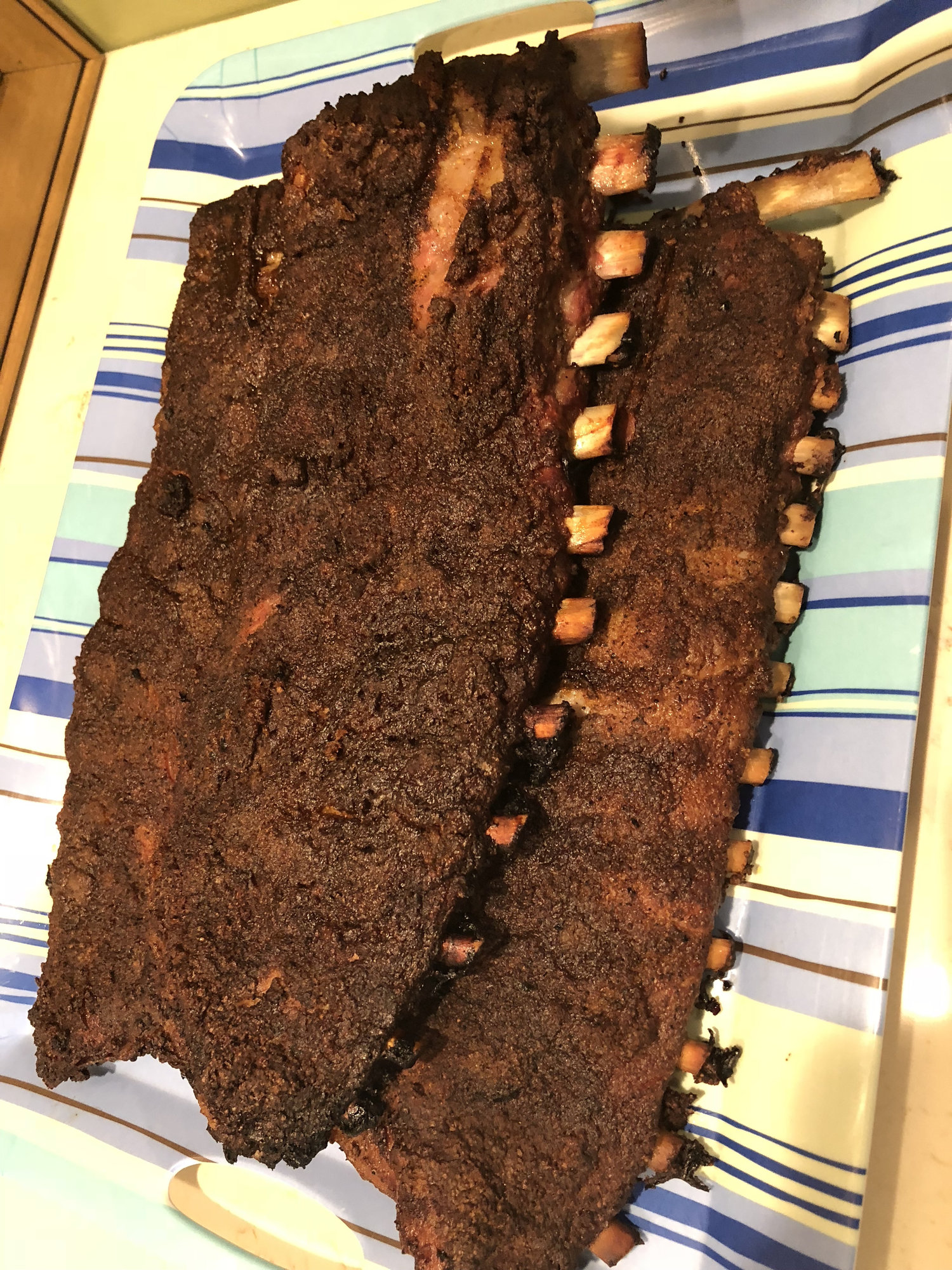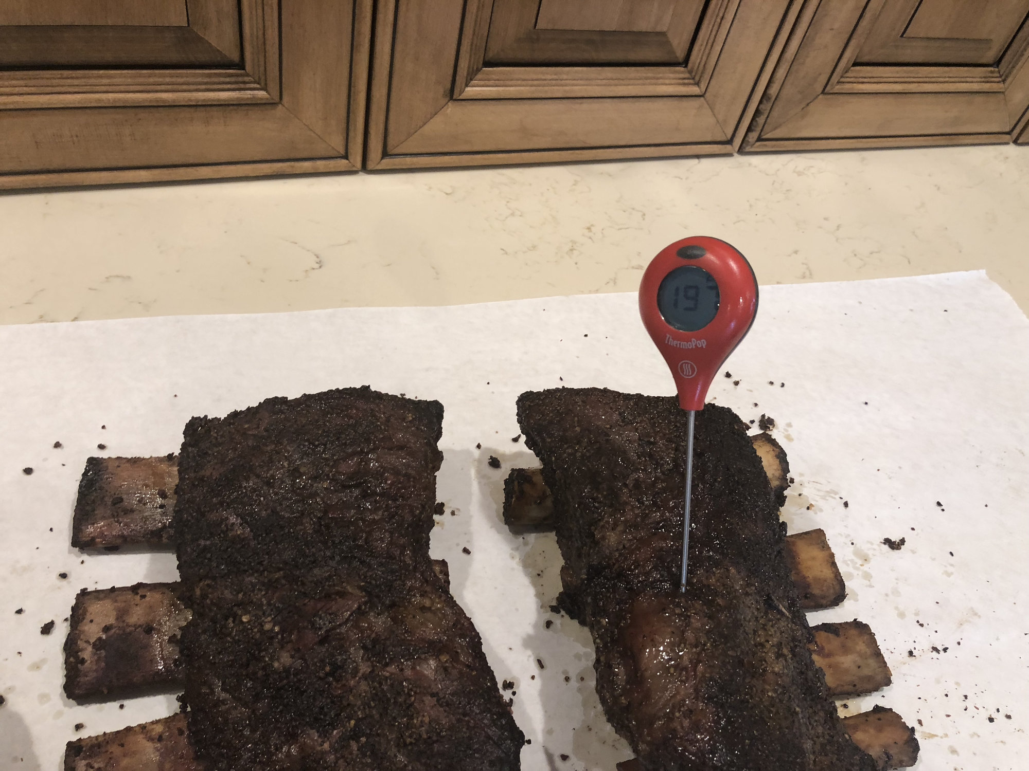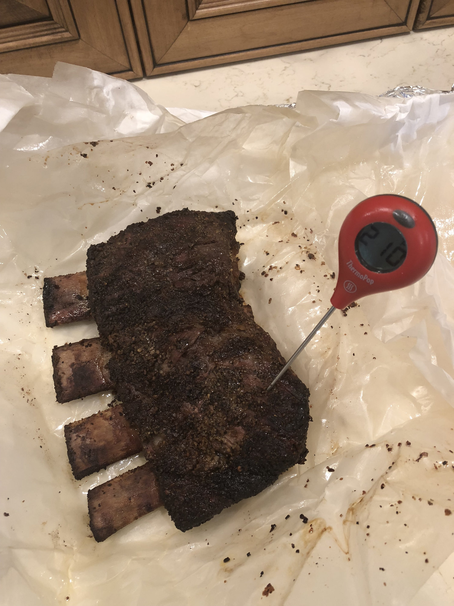 Moleman its really simple I just coated the ribs in Worcestershire sauce and then cover in montreal seasoning mix will cook at 250-270 until probe like butter most likely a IT of 195-205 and some 6 hours or so