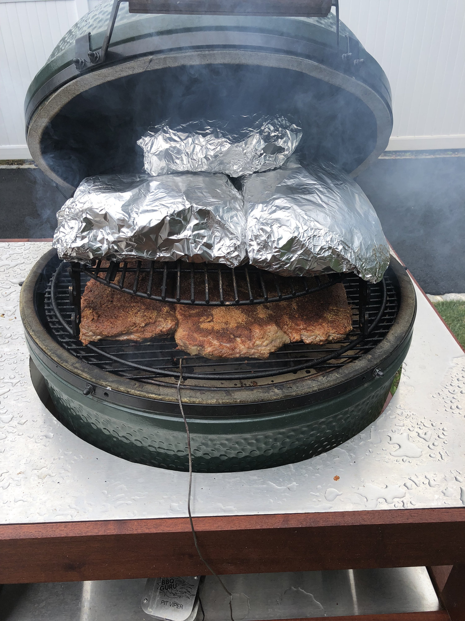 and as far as IT i used my POP and it reads around 185-190 Im assuming this is going to be the stall because if not, they are cooking way to fast. Should I do anything to slow them down wasn't planning on FTC till around 3-4 as were eating at 6. Egg has been holding pretty steady at a grate temp of 270 and the dome temp reads 260 since I moved the clip to read over the platesetter and not directly over the open flame. I still have the 3 racks of pork ribs which I have to cook and at that time I was going to add the rig and raise the cow ribs to the top rack and place the pork ribs on the bottom shelf where the cow ribs are now. As im typing this the sy just opened up and it is now pouring