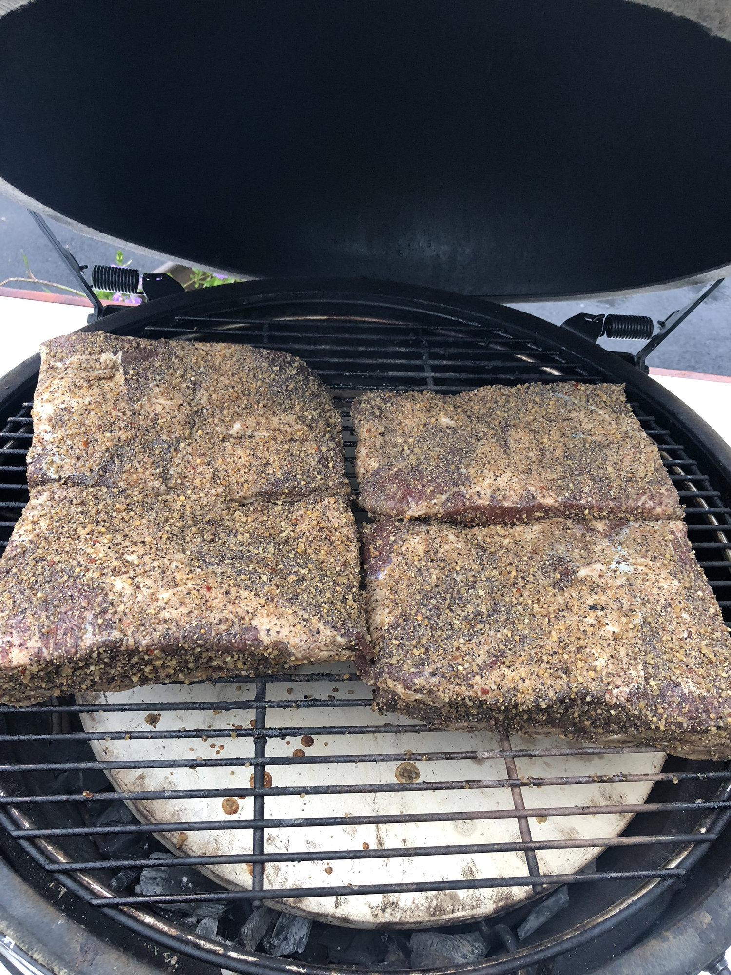 Anyway back to the important stuff the Beef Plate Ribs have been simmering in worcestershire sauce and montreal rub for 2 days in the fridge and are now ready to go into the XL at 250 for the day will keep you posted, as im typing this the promised rain has finally made it and its going to be a wet cook