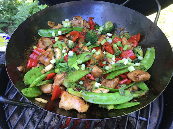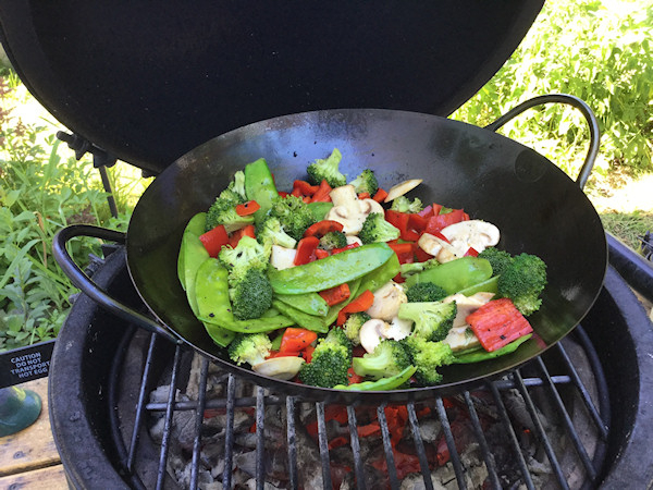 12" wok (I think) flat bottom on the Mini Max. After the MM was heated, I shut the bottom vent and kept the lid open, except for a little when cooking the vegetables when I closed it on the Wok to try and 'steam' the vegetables a little ... it worked!