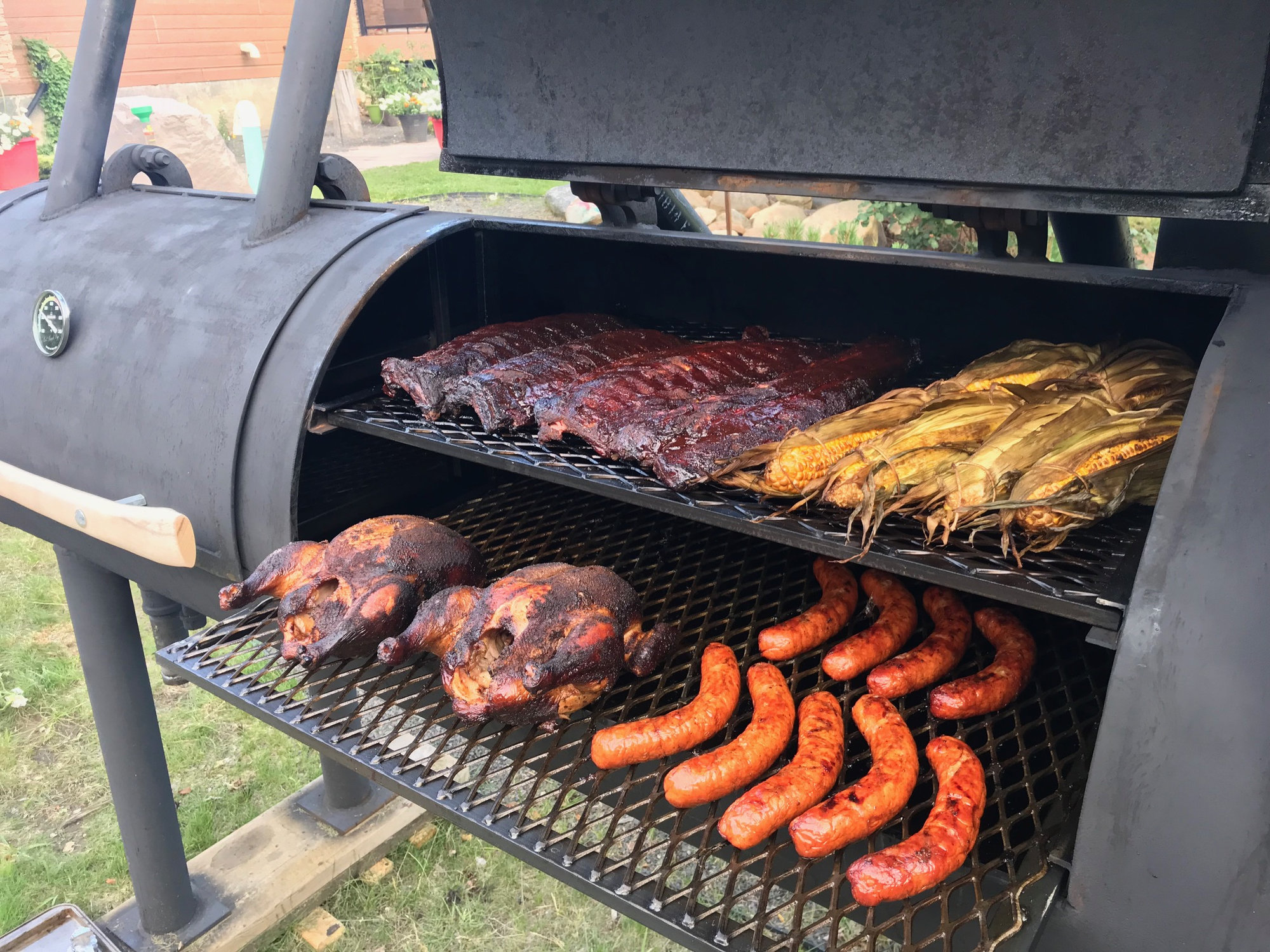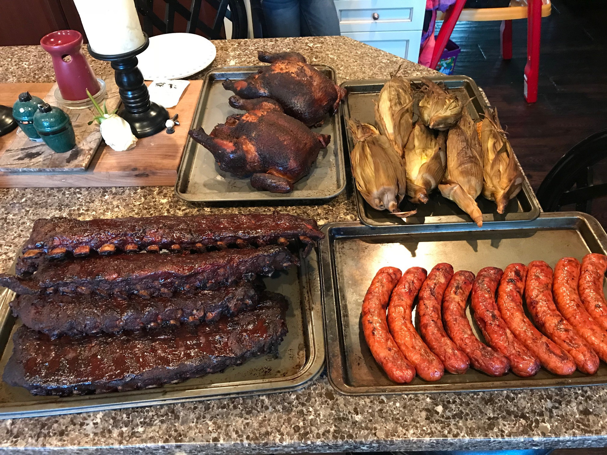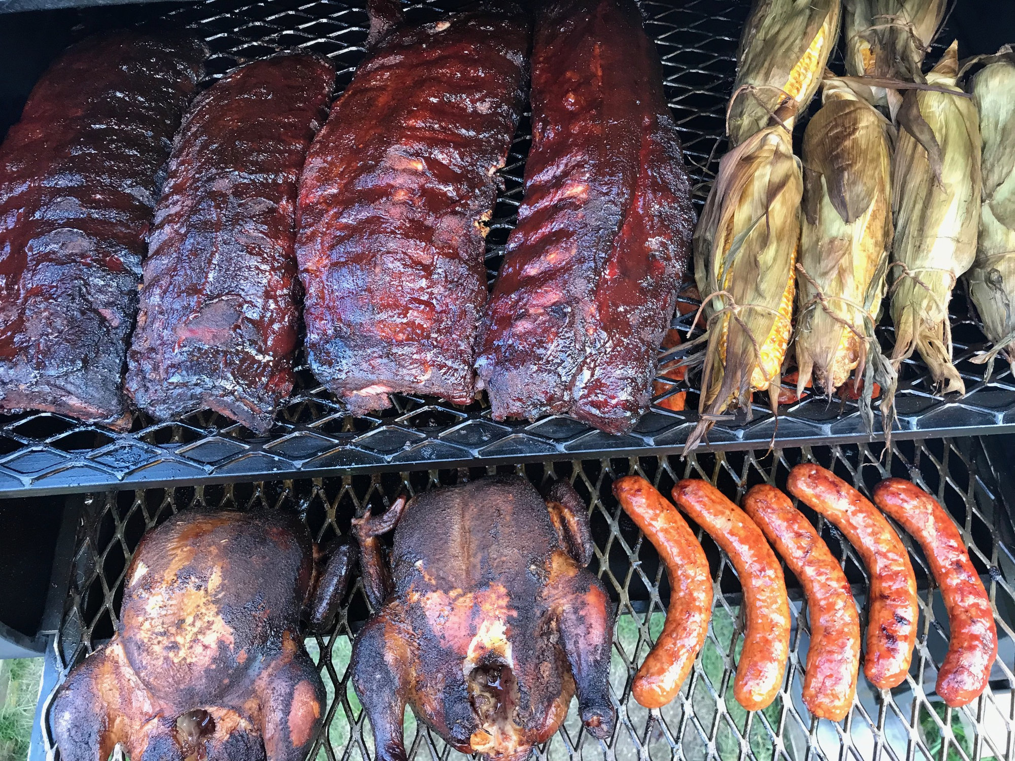 There was only a few of us, had some leftovers for sure. No the timing worked out good for everything, chicken sausage and corn all finished at the same time. The ribs finished a bit early which was good because I wanted to try out the warming cabinet on the side. Worked great then I put the ribs back in the CC for the last 15 min.GrateEggspectations said:Quite a banquet. How many were you cooking for? Did you find it hard to time the various components of the meal so that they were all ready at once?