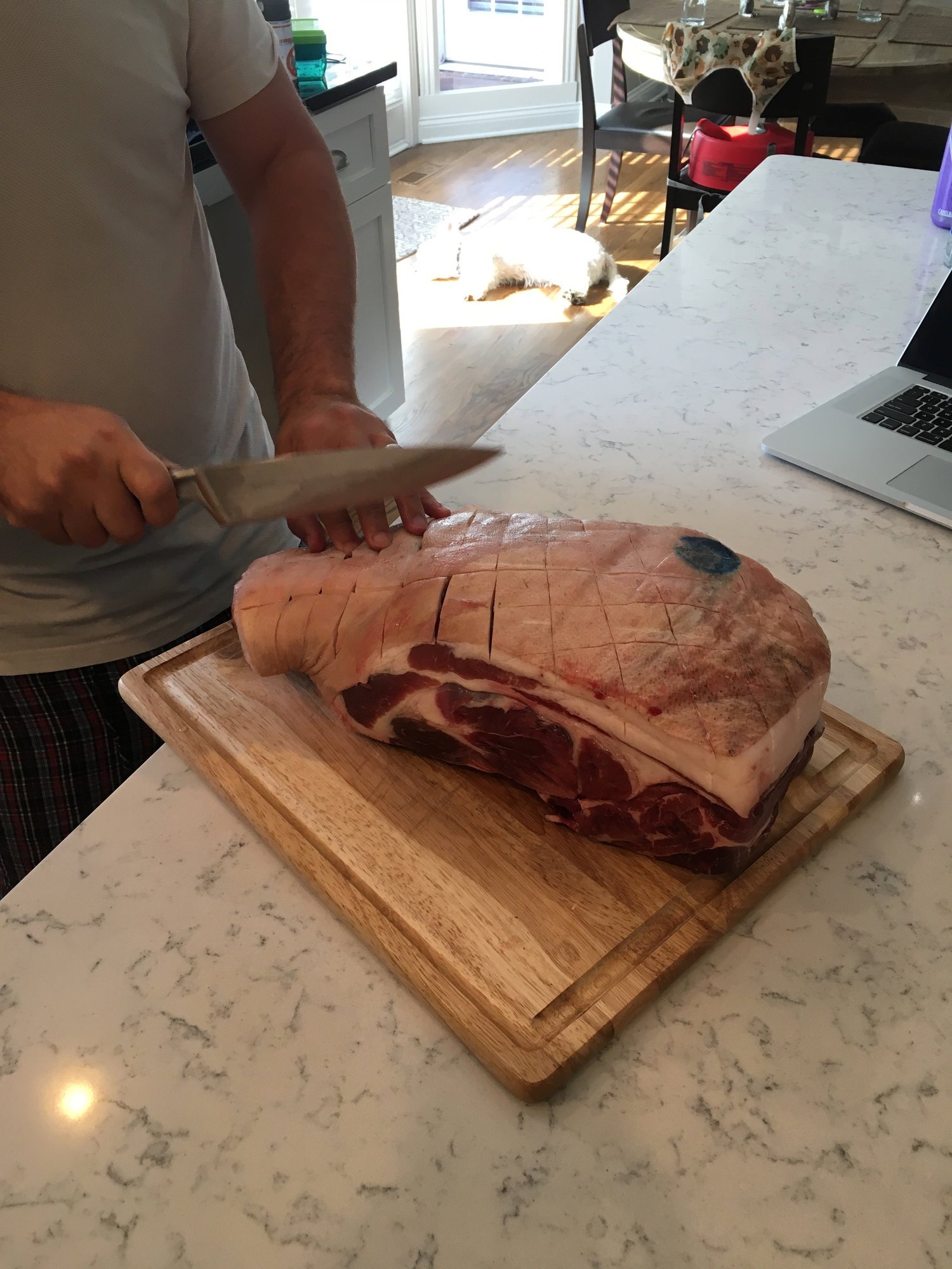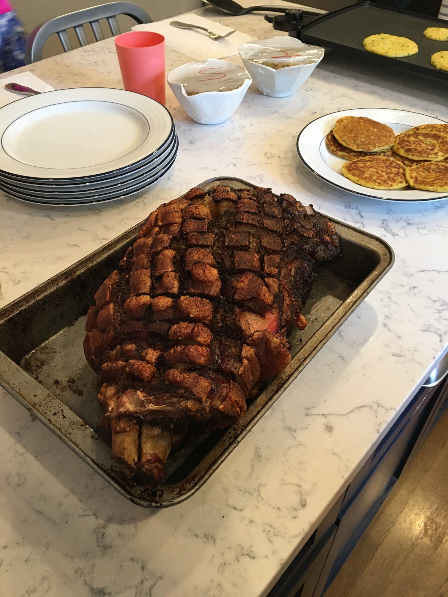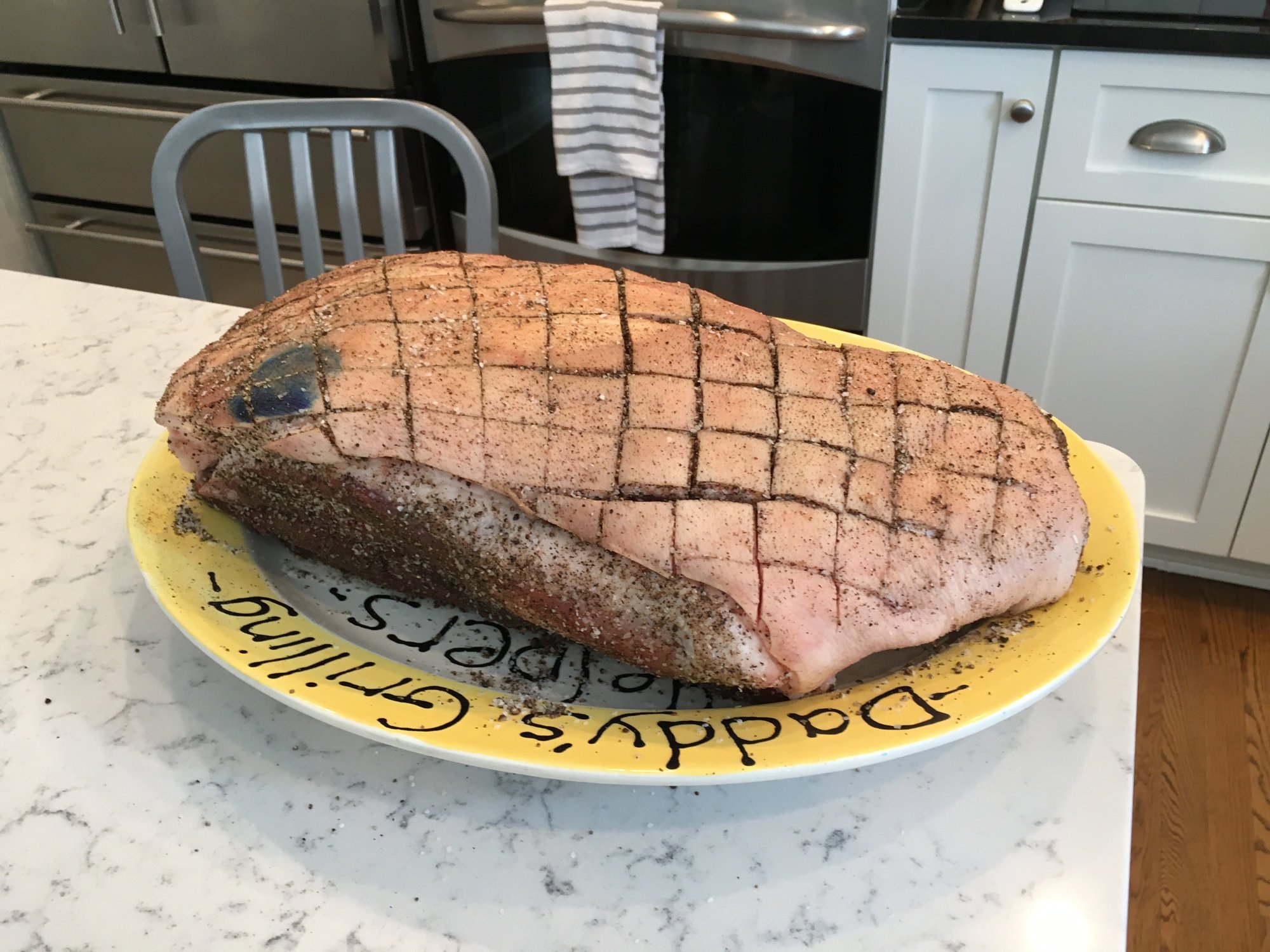 My neighbor bought half a pig a while ago, and since providing many cooks on the egg for him and his family, we finally came to the agreement of him supplying some meat and I would cook it.  He supplied a 14.6lb Berkshire Picnic Roast.  Lots of research was done ahead of time, and with a roast like this we couldn't not have some "cracklings"