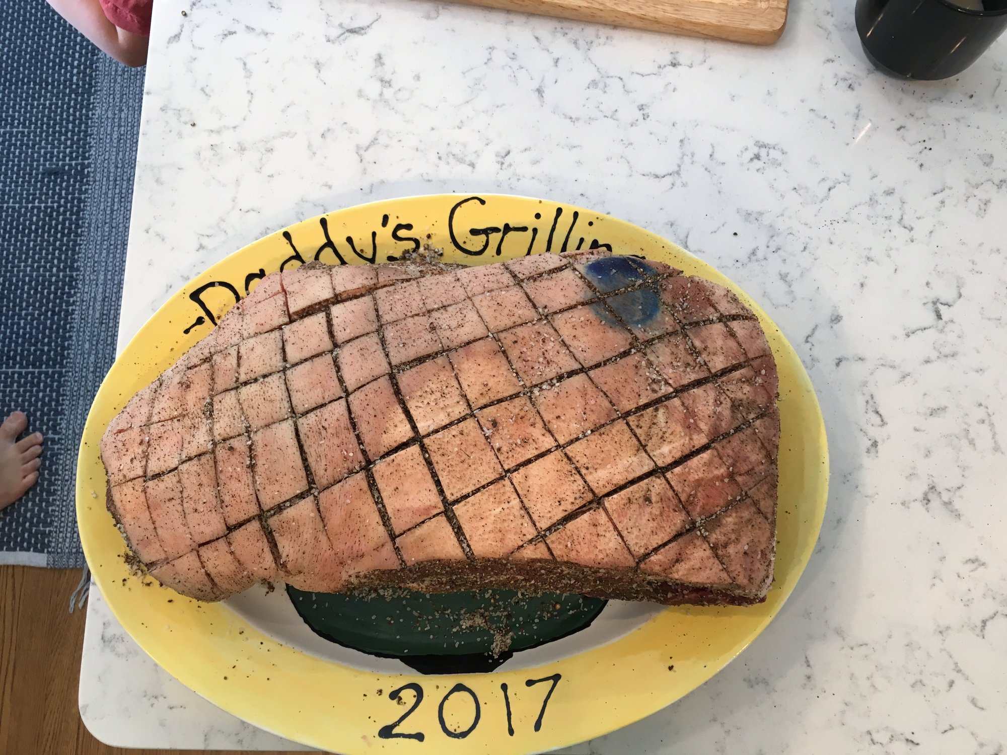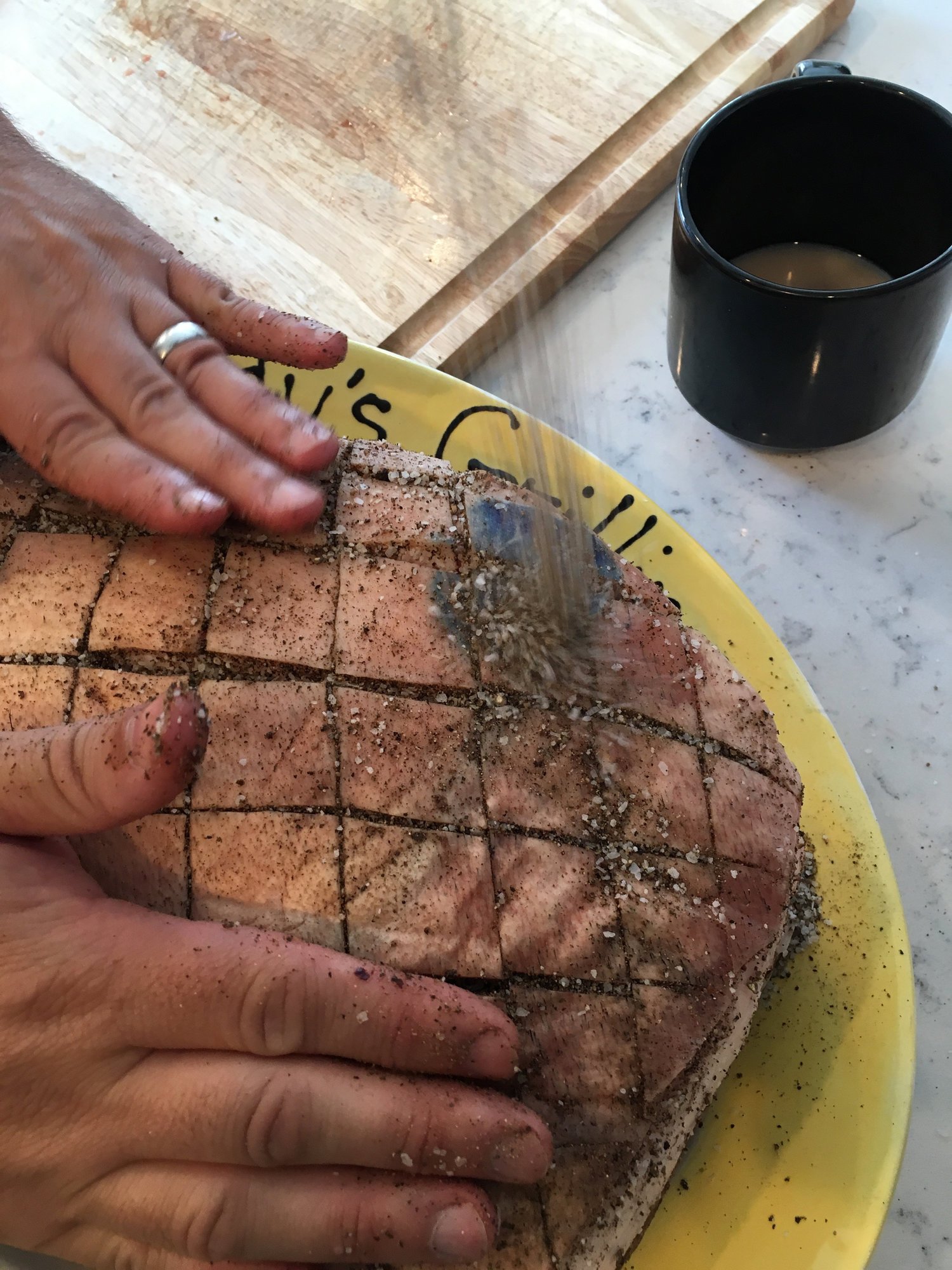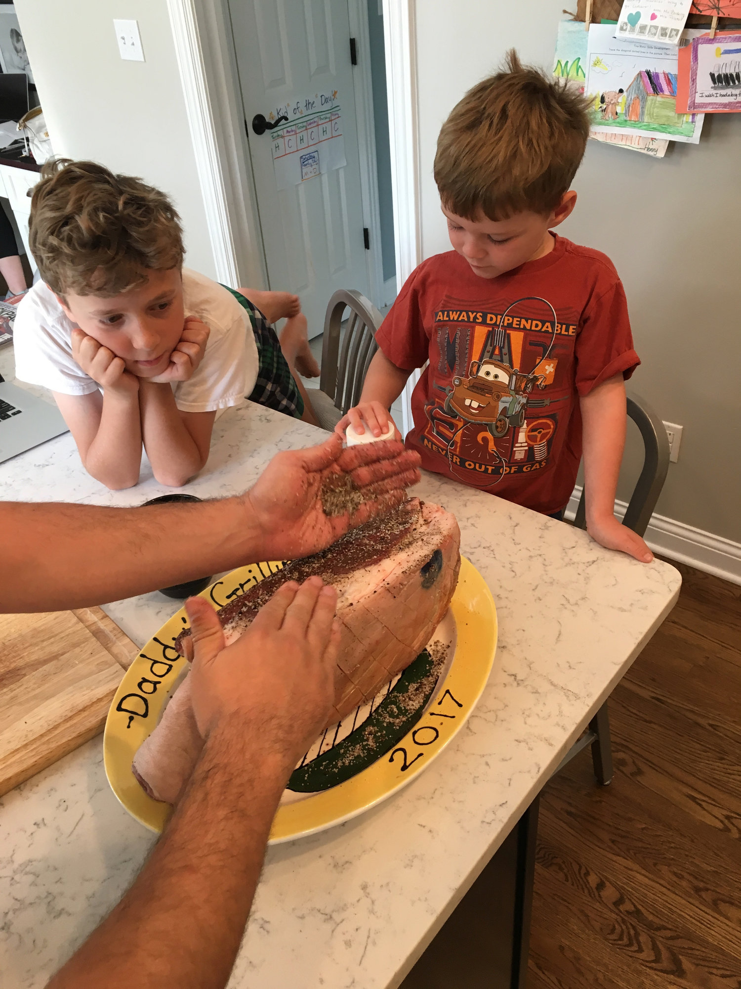 Rub we debated.  We went back and forth on doing something like a dry rub from Dizzy Pig (one of my favorite rubs) or just a simple salt and pepper with a hint of garlic powder.  The vote was for the salt and pepper (helpers included in the vote and spreading)...