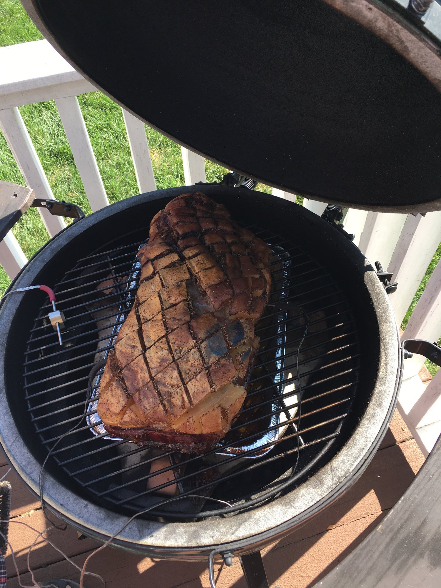 We let it sit in the fridge for about 5 hours (uncovered).  Loaded up the Egg with some Rockwood Charcoal (@stlcharcoal), platesetter in with the legs up and NO smoke.  Some people/reviews stated the addition of smoke will effect the crispness of the "cracklings".  And off to the races we went.  Knowing that this would cook like a Boston Butt (1.5-2hrs/lb) I knew I was in for the long haul.  Put it on at 3:30pm on Saturday.  Have to admit, I sort of missed smelling the smoke, or even seeing some of the smoke.  But the few whiffs that I would get, I knew it was going to be good.
