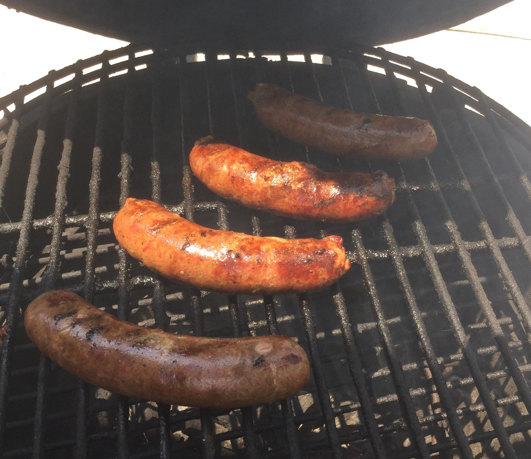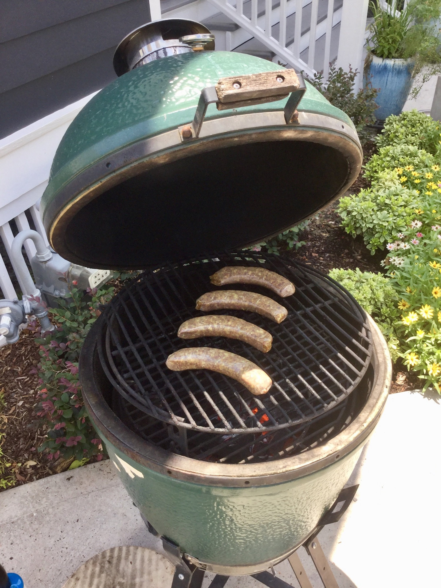 A work buddy is coming to pick up our LBGE today, and I put him off a few hours so I could get one last cook in.  While it had to be pork, I went with something simple that only took two years, two days and thirty minutes to cook.  Two years to raise the hogs, two days to butcher them and thirty minutes to light our egg and grill four lovely masalawurst from our last get together. (https://eggheadforum.com/discussion/1212307/sauscutapalooza-awss5-the-final-conflict/p1).