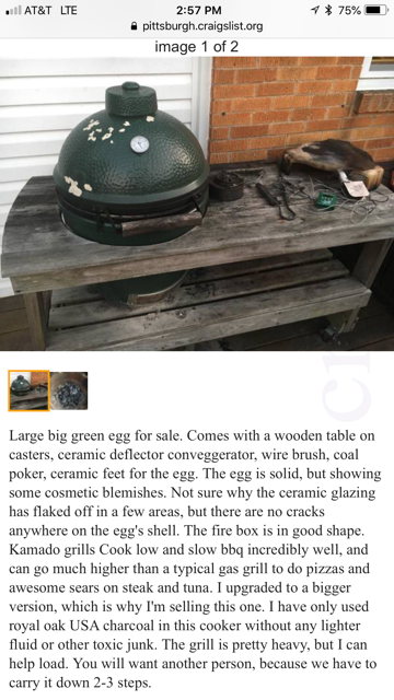 Where in Pittsburgh? I looked at that egg on craigslist for a friend but decided against it because of it's looks and lack of a warranty. For me I would not be as concerned but not for a new egg owner. I'm always searching craigslist for a deal on another egg.