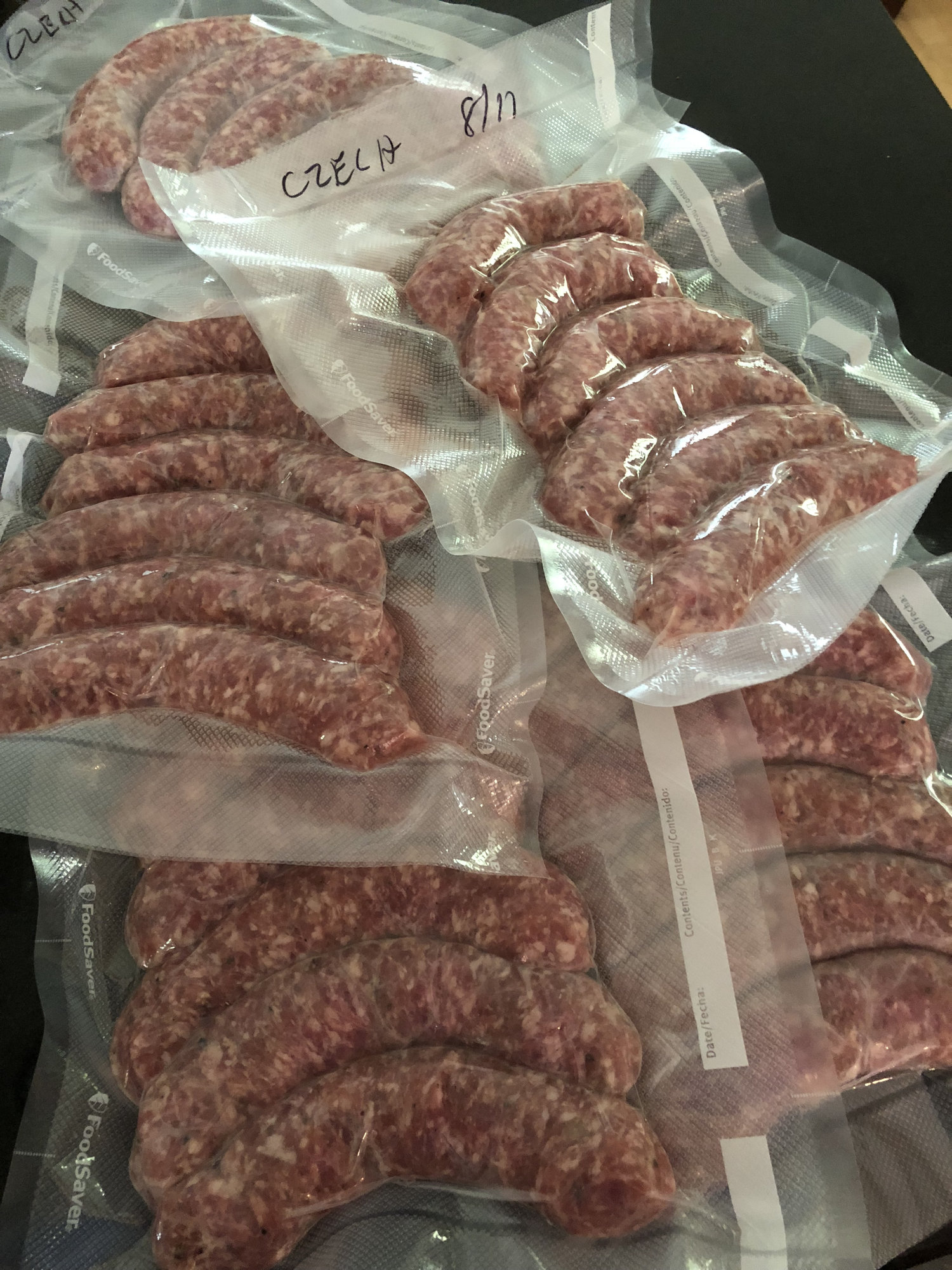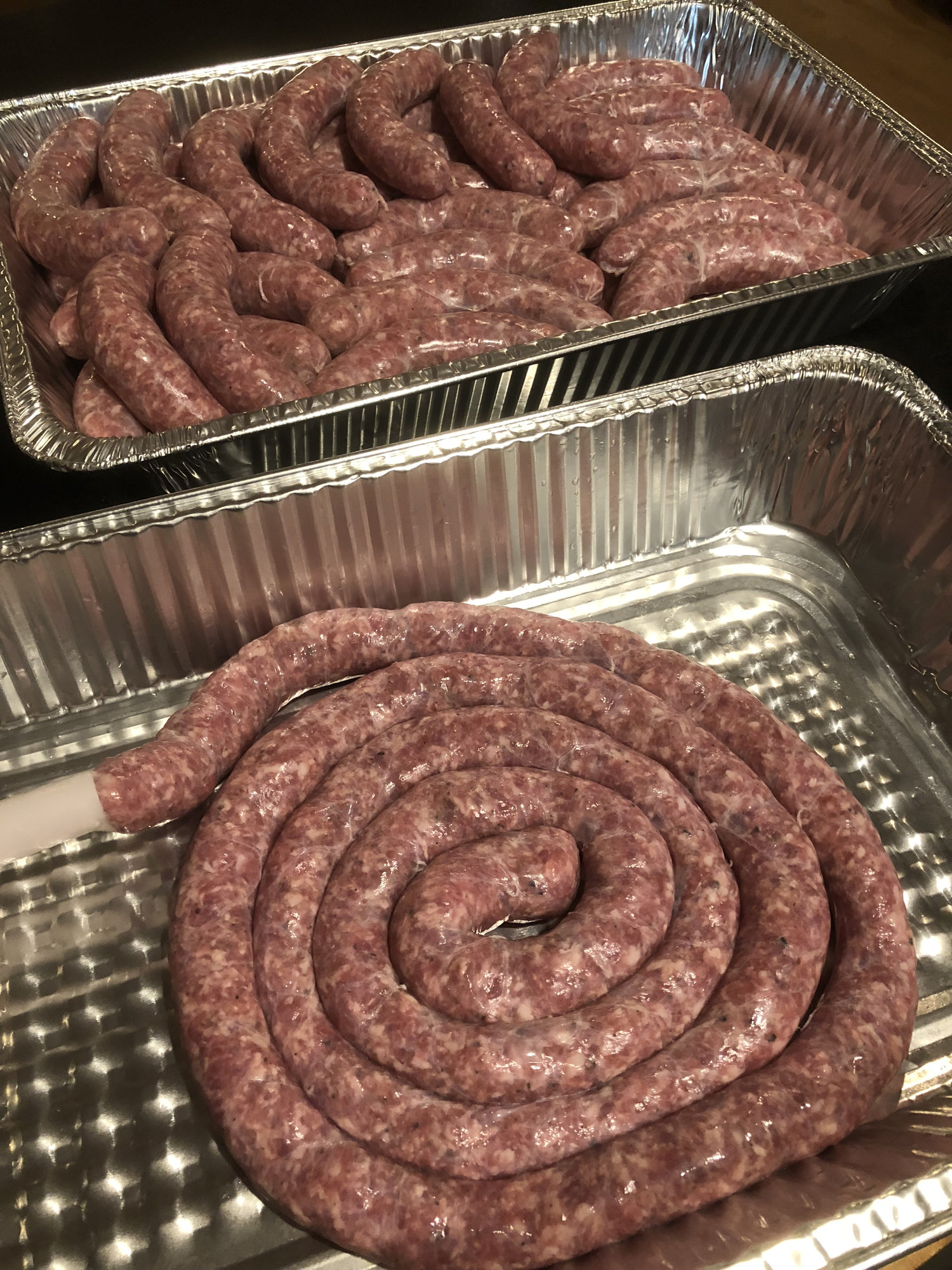 Made some pork belly burnt ends for good measure which also were great on the hard rolls. Everyone vacuum seals their product and goes home with about 20 links.
