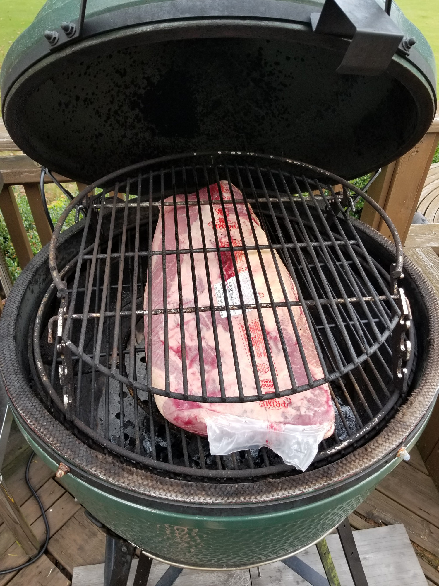 Did a trial run this morning to figure out the best position.  Even with the brisket down a level or 2, the size of it puts it about 2 inches away from the dome.    And with 3 - 9 pound butts below its hard to get the top grate down any further.