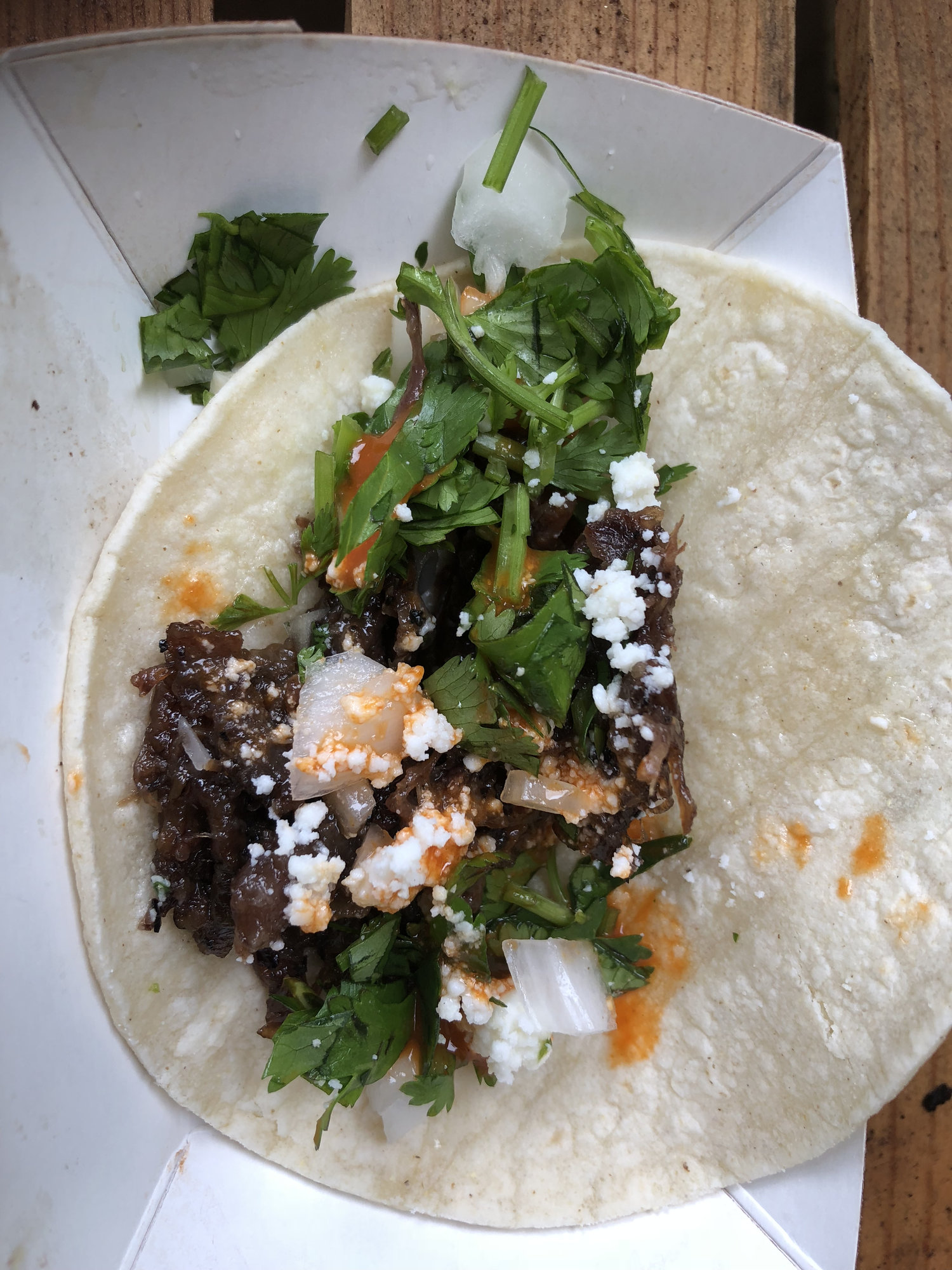 Beef cheek barbacoa (shredded after the confit step and served as a taco).