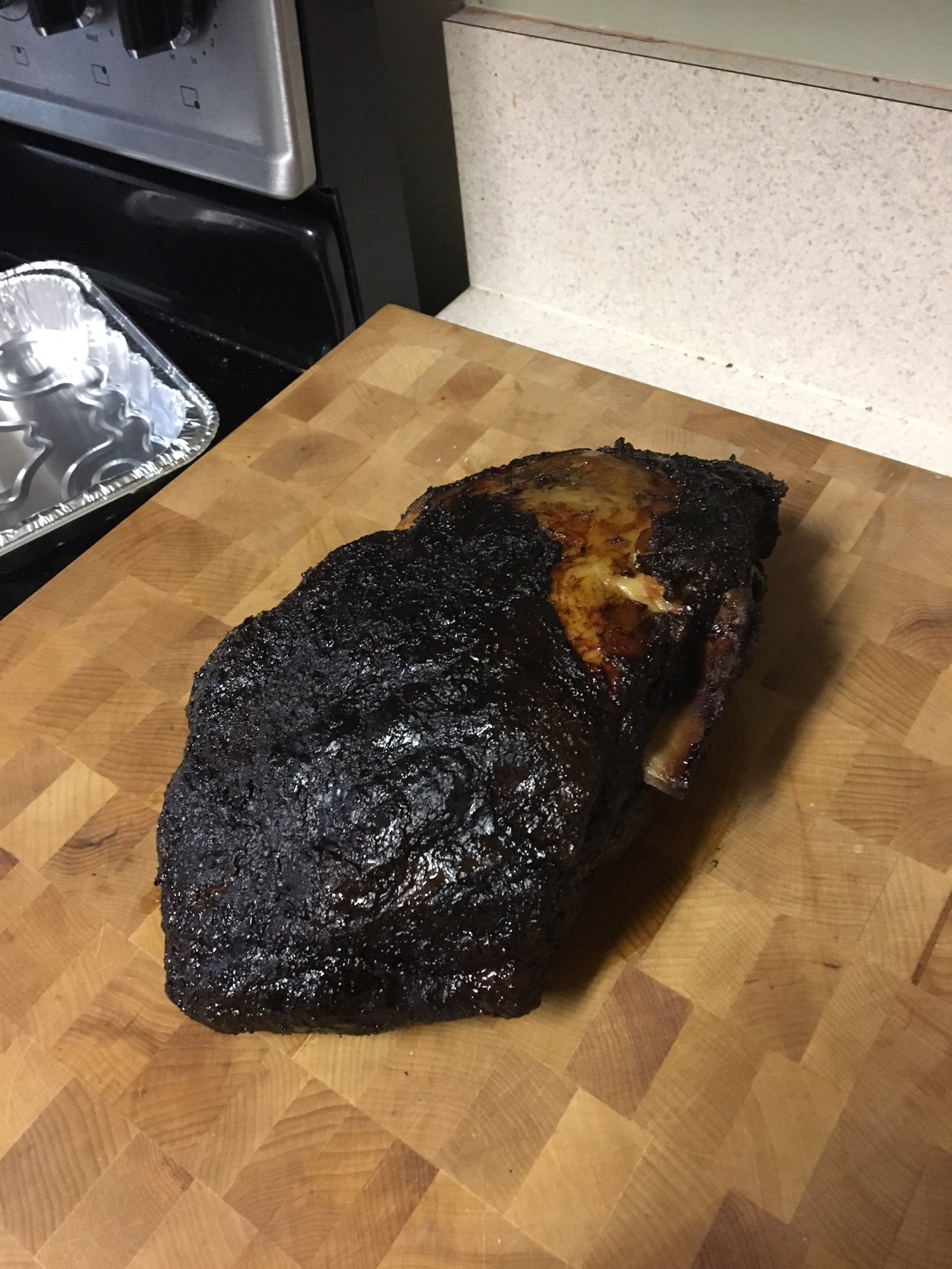 Rubbed with Wassi's Sweet and Smokey, over coal and pecan wood with a water pan to catch drippings. Fat cap up, 245 degrees for about 12 hours.  These were the only pictures I took, and it came out the best I've made.