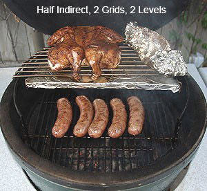 We don't recommend the half grid on the lower level of the PSWoo or EGG Eggspander. If you want this type of set-up, just use the EGG full grid on the fire ring. This way you can use the most productive part of the grill - the center. Using a half grid cheats the cook on heat and cooking area.