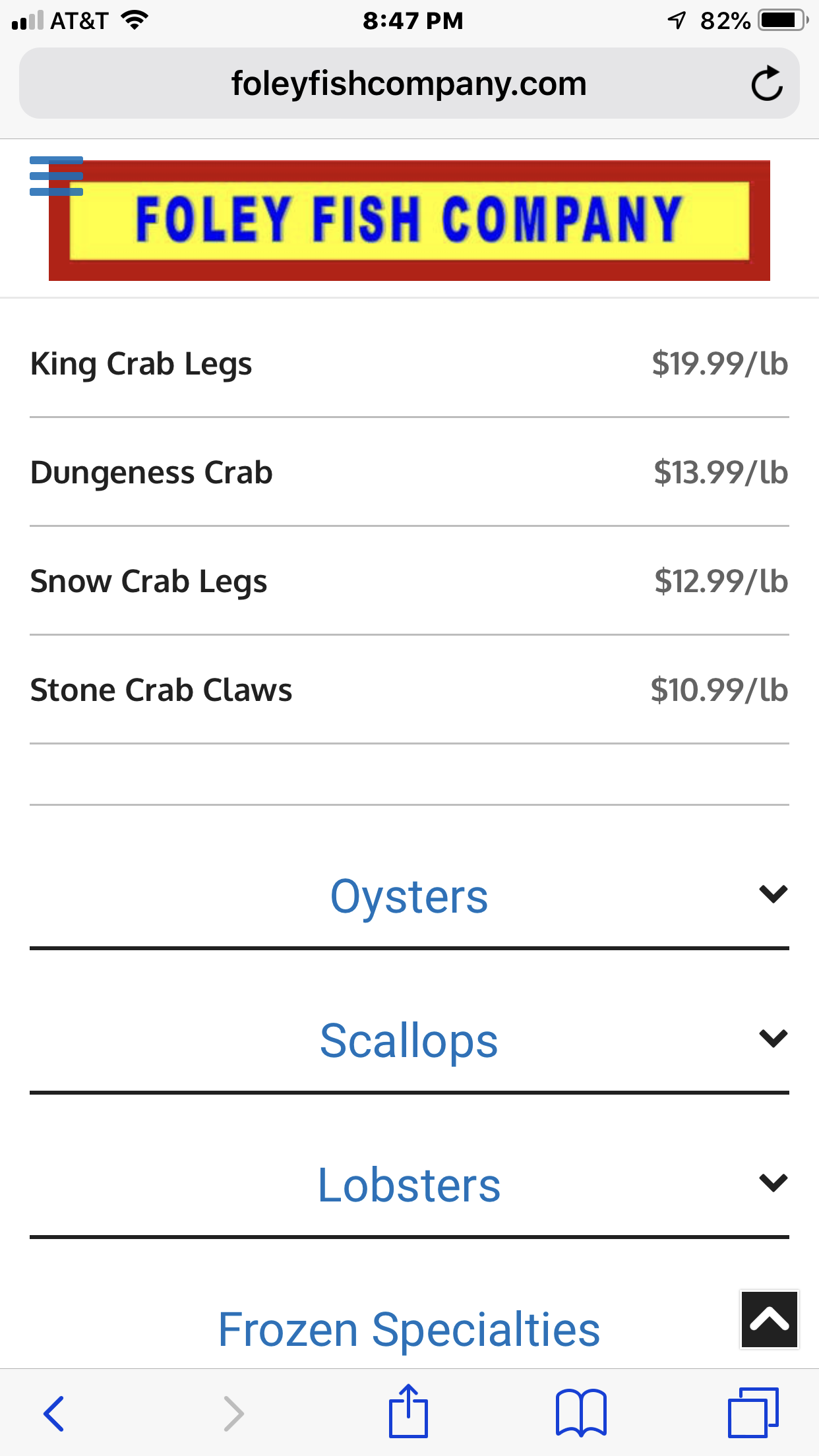 I live in utard. We don't get stone crab claws, but we do have Mrs. What's-Her-Name's fish sticks; they're relatively inexpensive.
